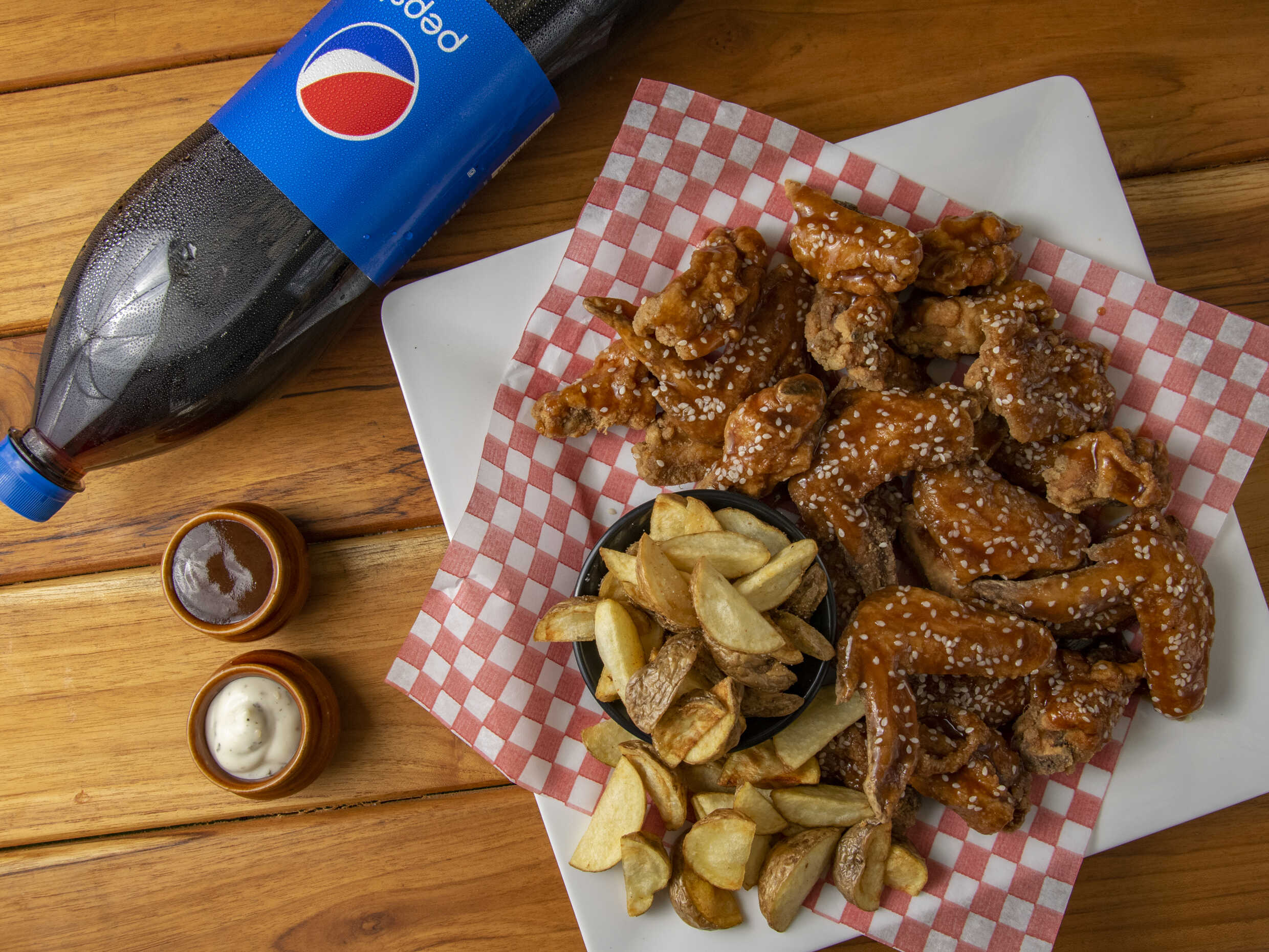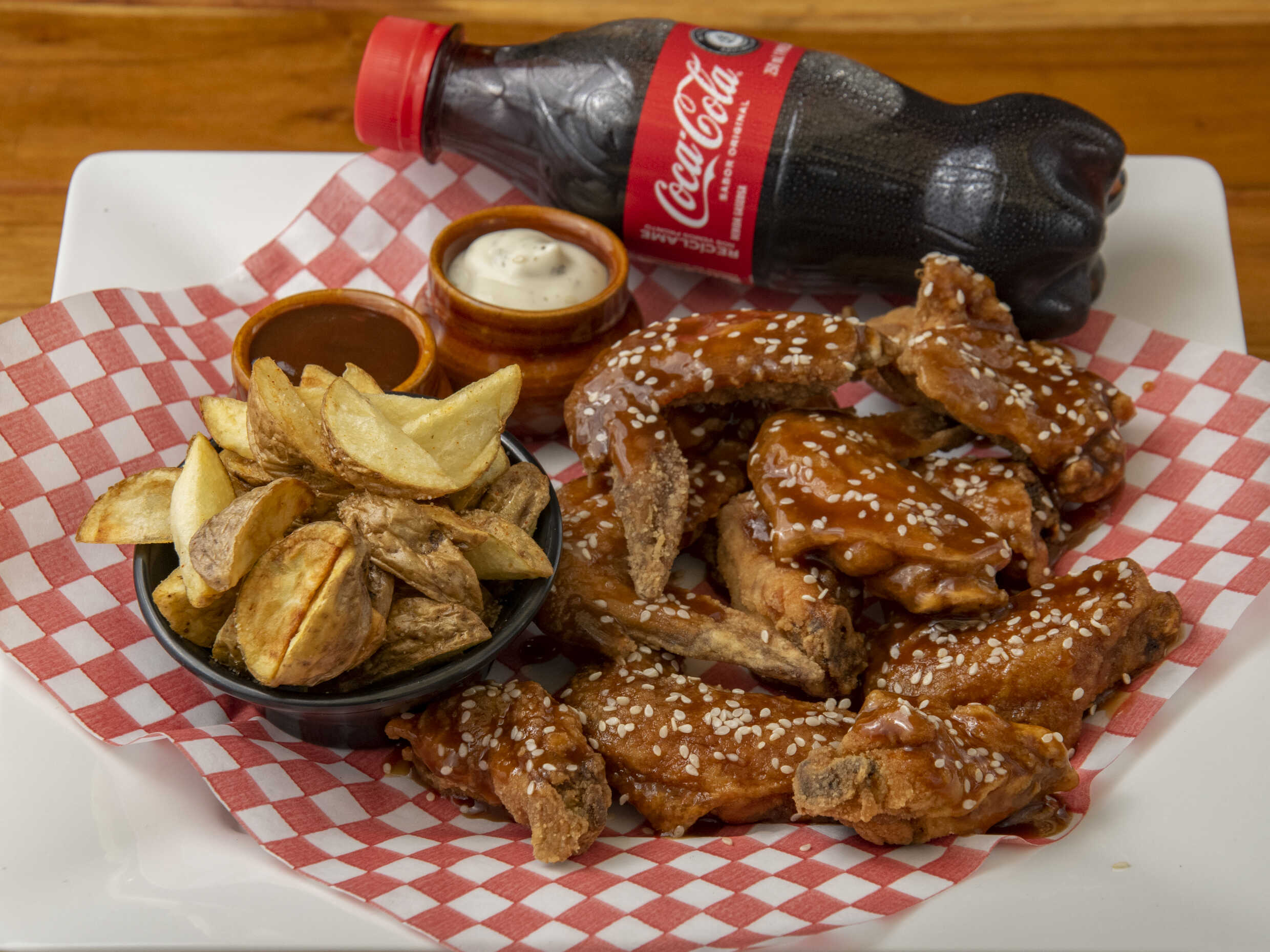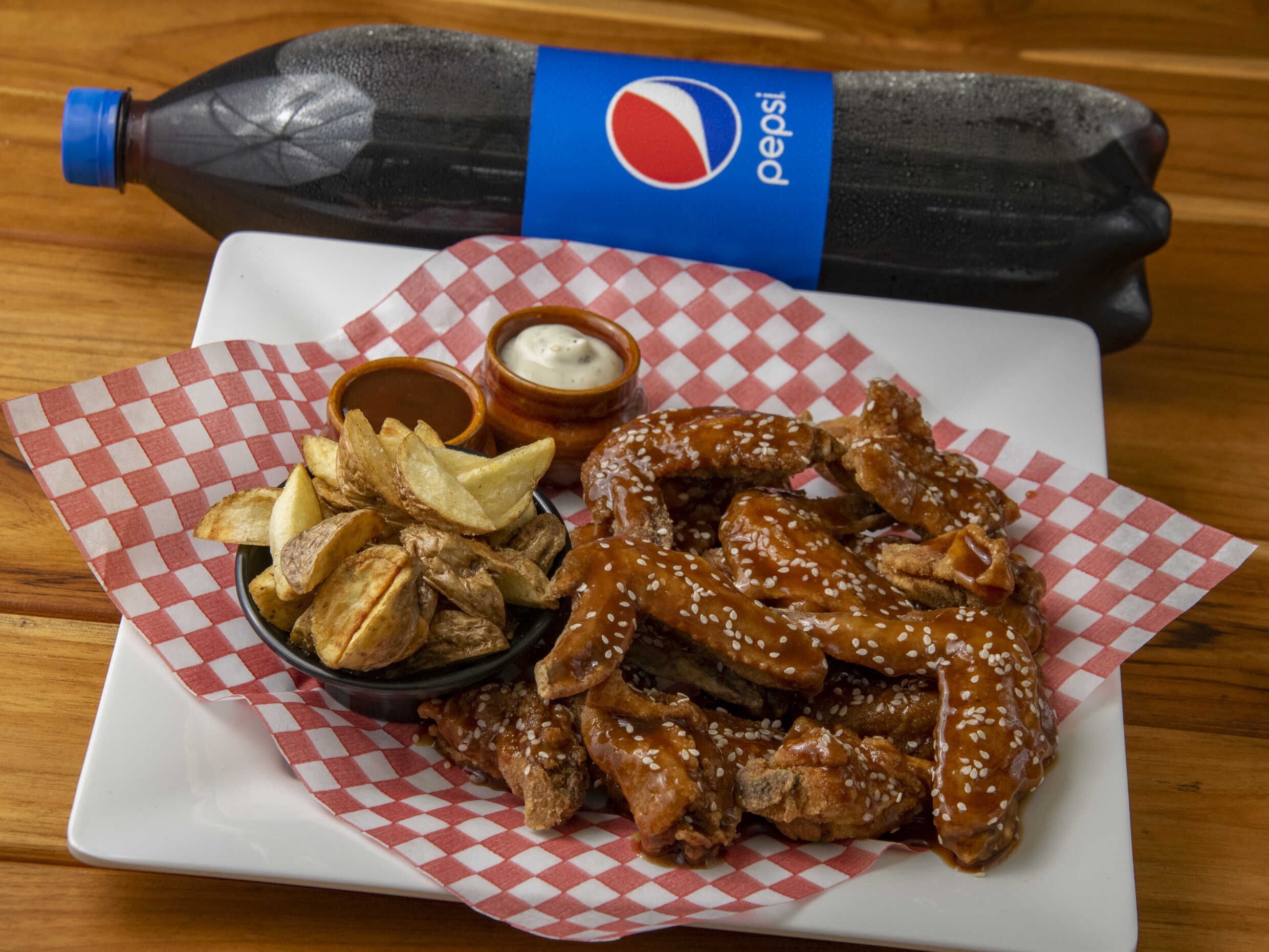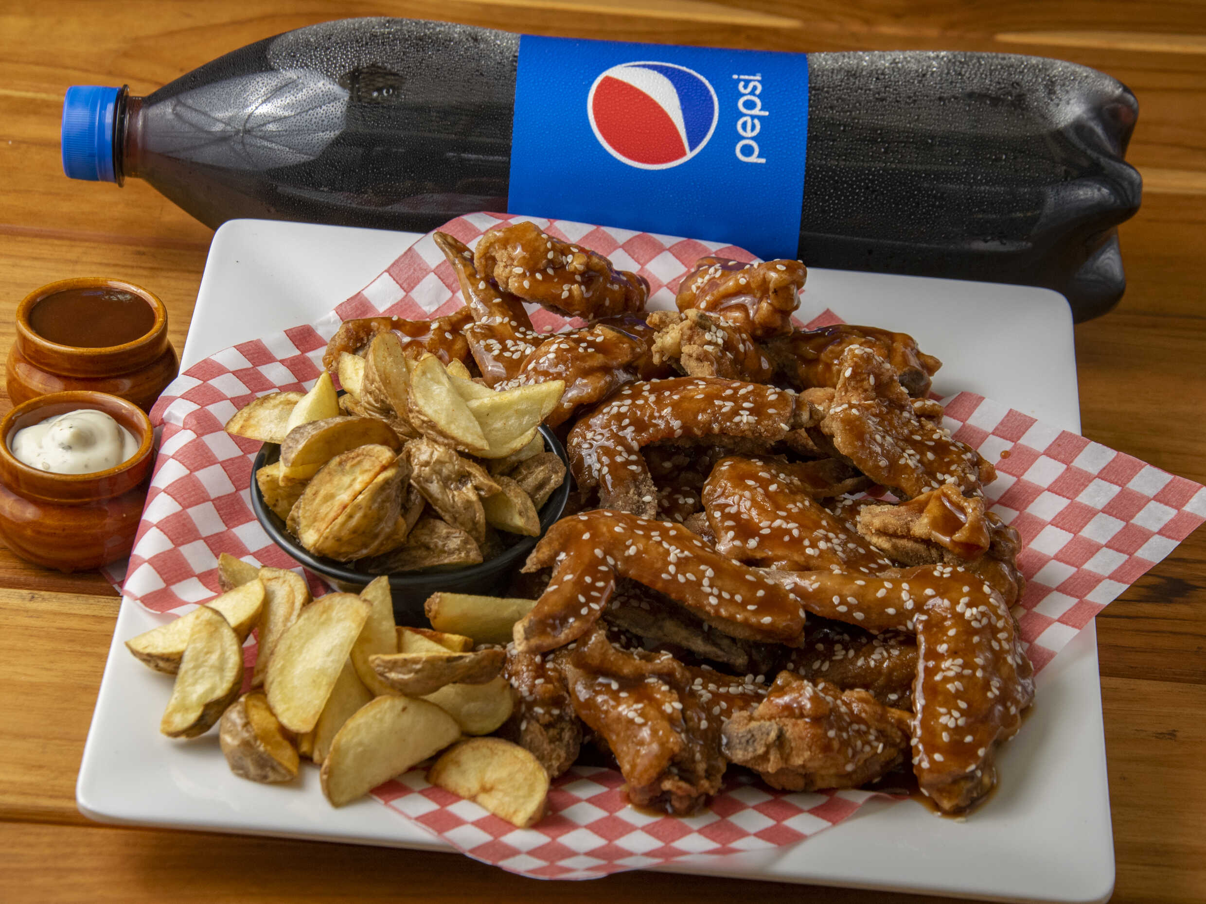 28 Deliciosas Piezas de Alitas BBQ acompañadas de una Porción de Papa a la Francesa Artesanal de 150g. + 1 Gaseosa Postobón LITRO