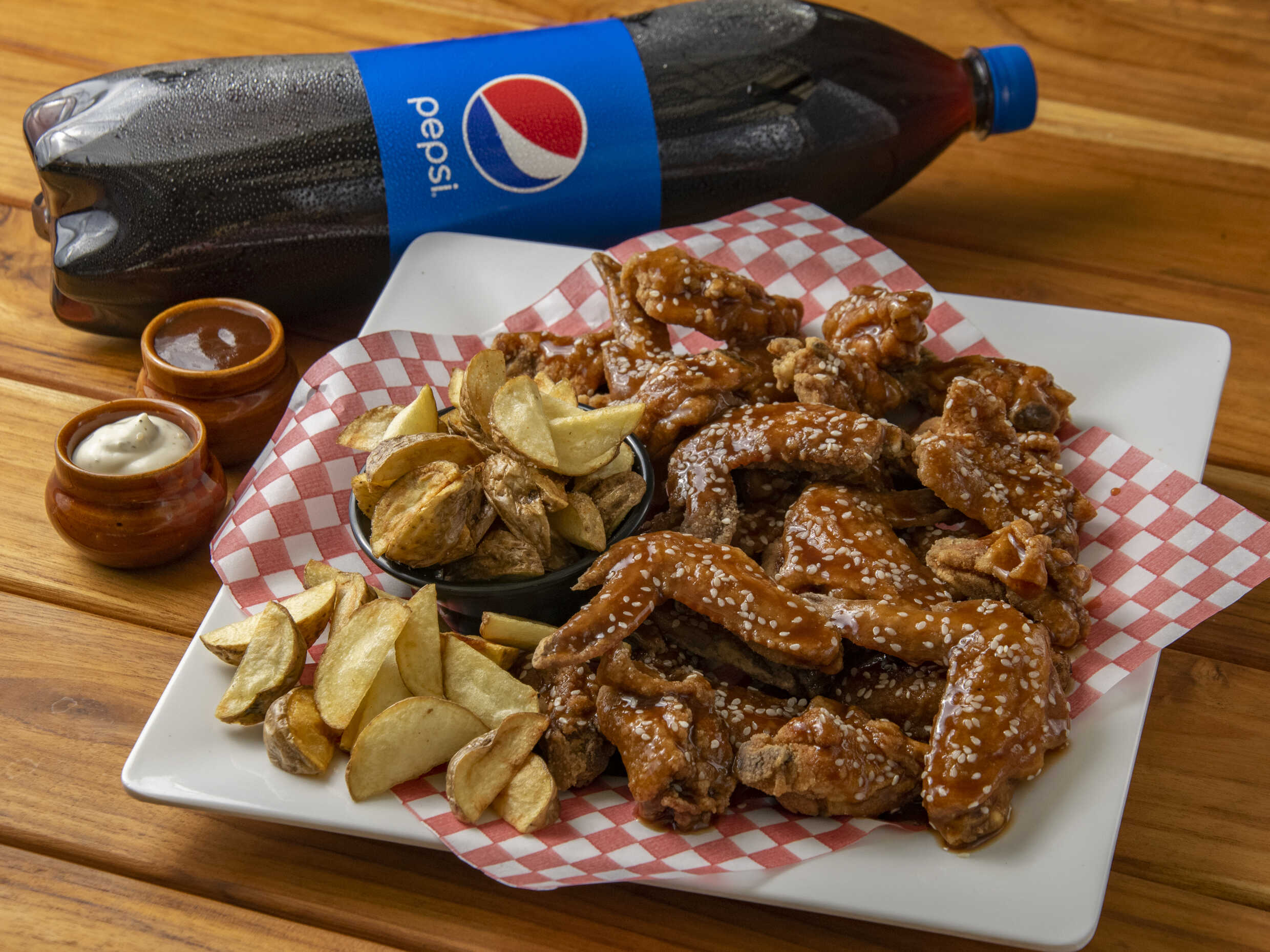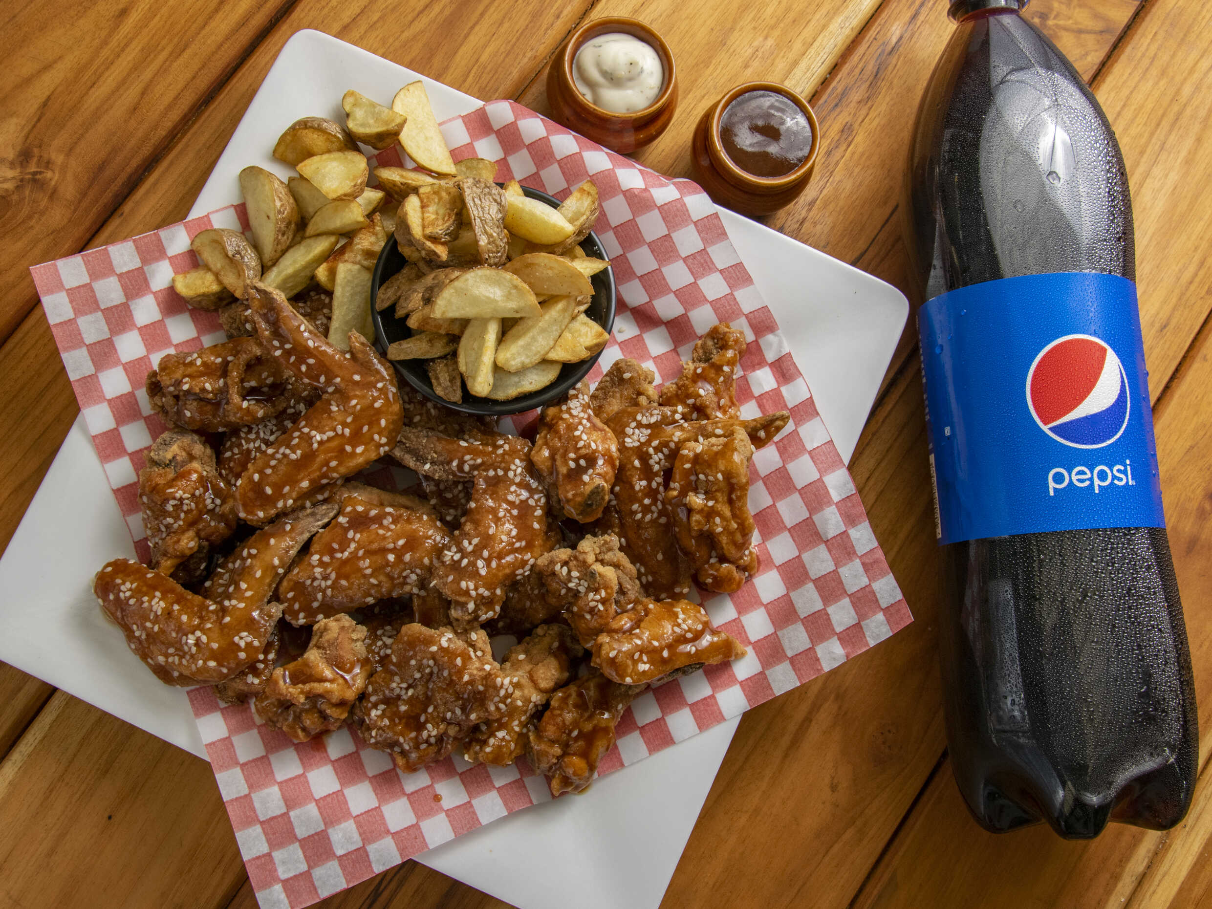30 Deliciosas Piezas de Alitas BBQ, acompañada de una Porción de Papa a la Francesa Artesanal de 200g. + 1 Gaseosa Postobón de LITRO.