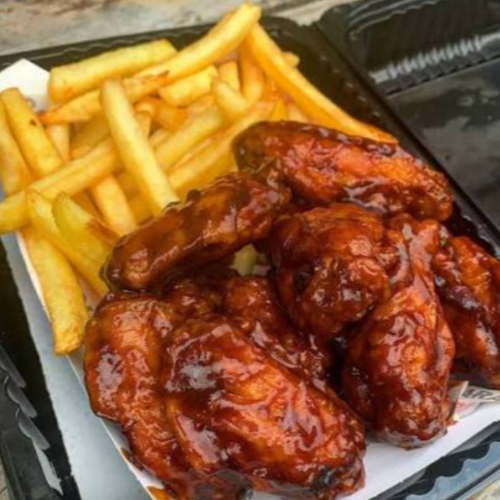6 Deliciosas Piezas de Alitas BBQ acompañado de 2 porciones de papa a la francesa artesanal de 150g.