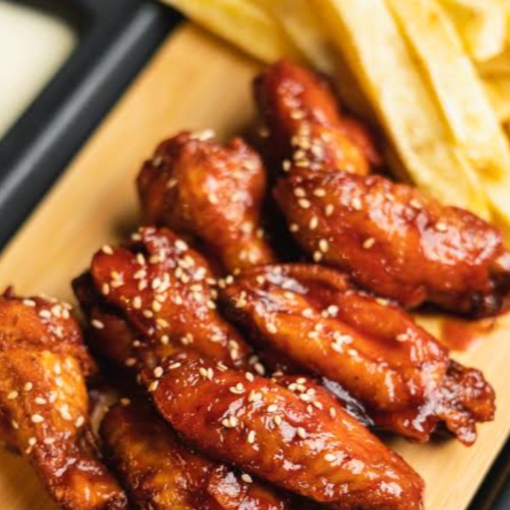 8 Deliciosas Piezas de Alitas BBQ acompañadas de 2 porciónes de papa a la francesa artesanal de 150g.