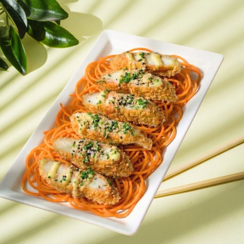 6 palmitos crunch, salsa fantasy, cebollín y una cama de zanahoria en espiral.
