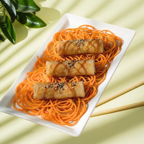 3 spring roll, salsa teriyaki, ajonjolí mixto y una cama de zanahoria en espiral.