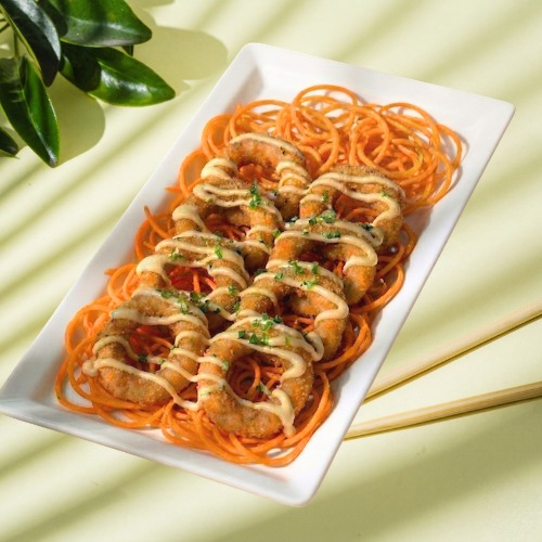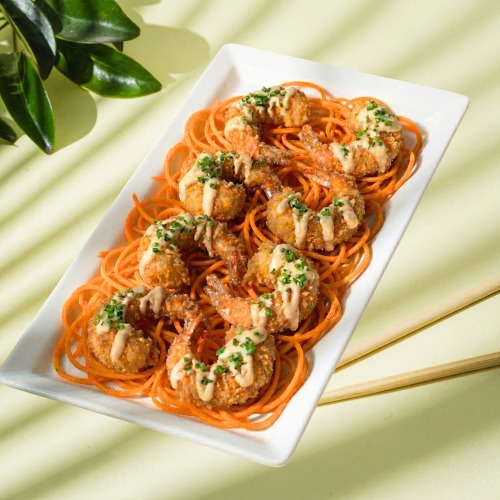 8 camarones crunch, salsa fantasy, cebollín y una cama de zanahoria en espiral.