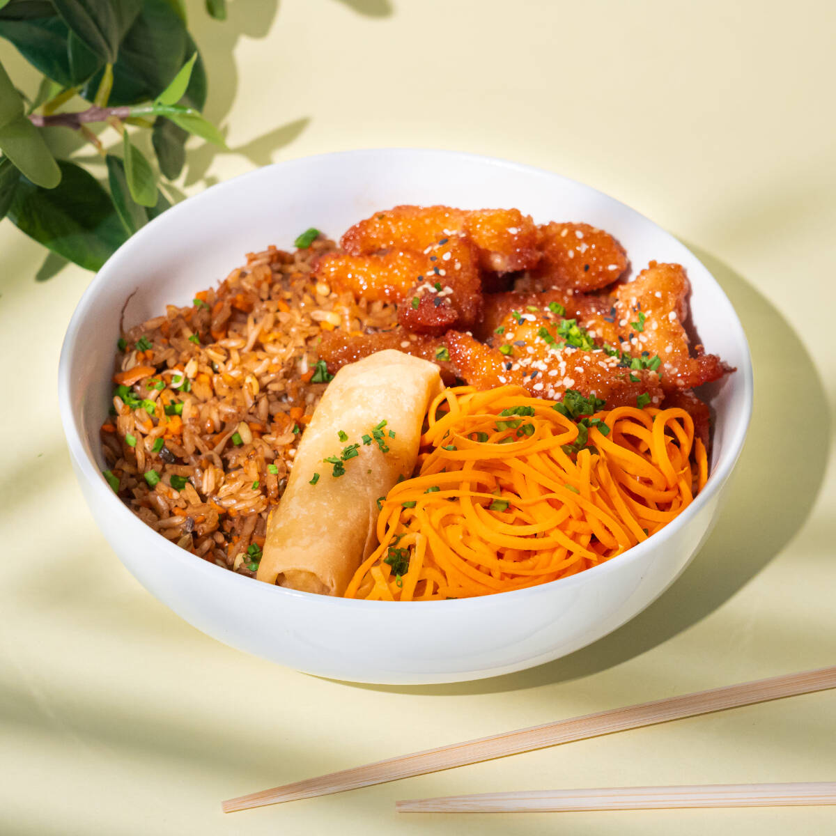 Arroz estilo chino salteado al wok con zanahoria, raíces chinas y salsa soya, pollo crunch bañado en salsa agridulce, zanahoria en espiral, un egg roll, ajonjolí mixto y cebollín.