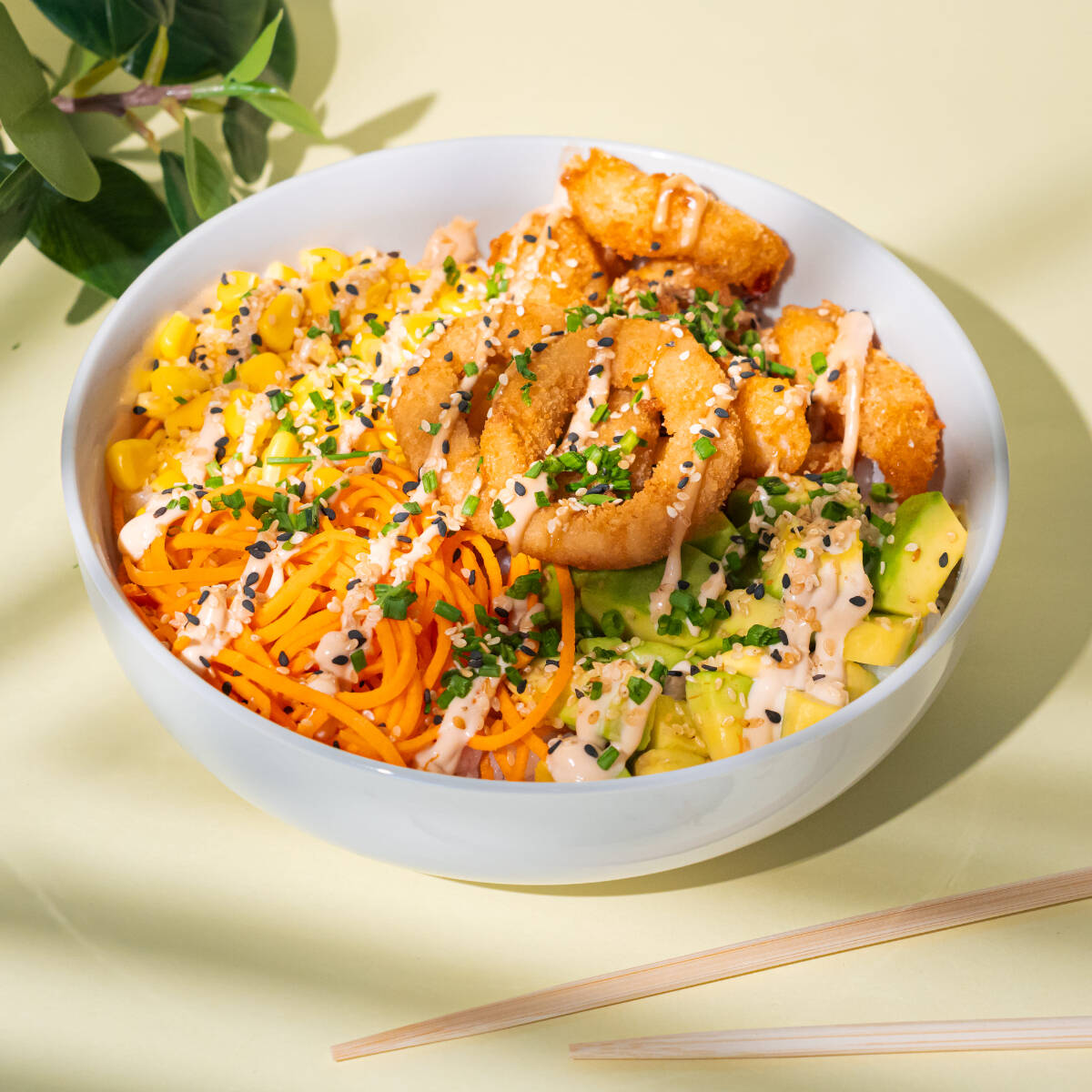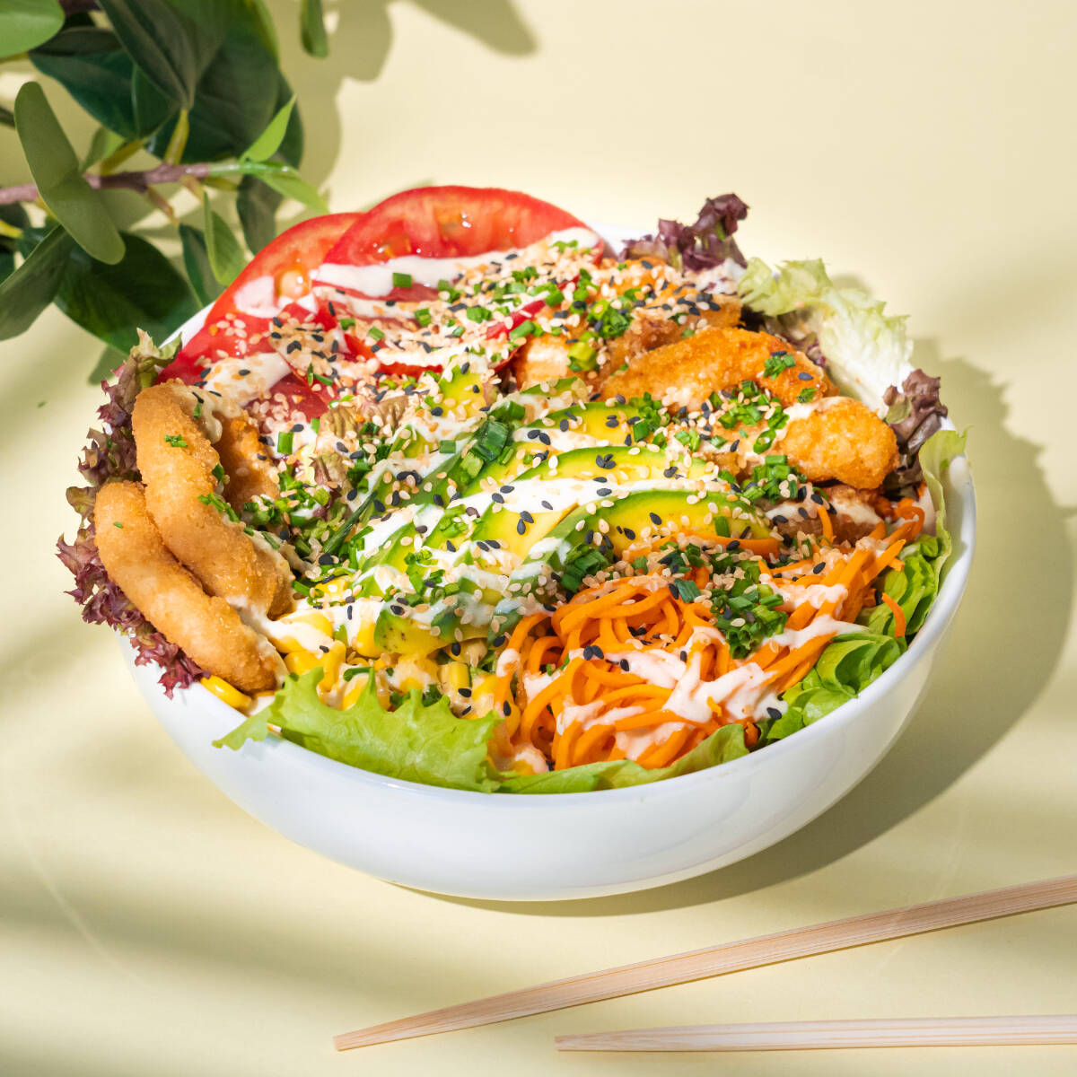 Ensalada con base de mix de lechugas y tomate, camarones tempura, maíz tierno, aros de cebolla, aguacate, zanahoria, cebollín y salsa.