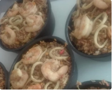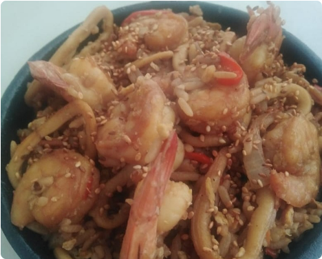 Arroz saltado al wok bañado en salsa japonesa con mariscos, camarones, calamares y langostinos.