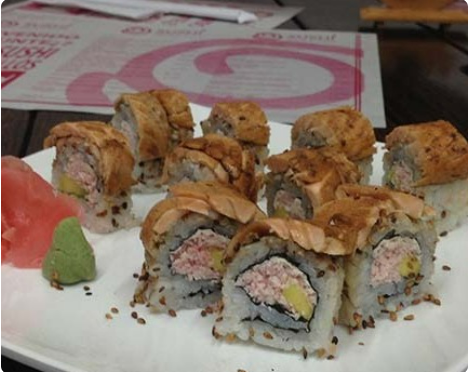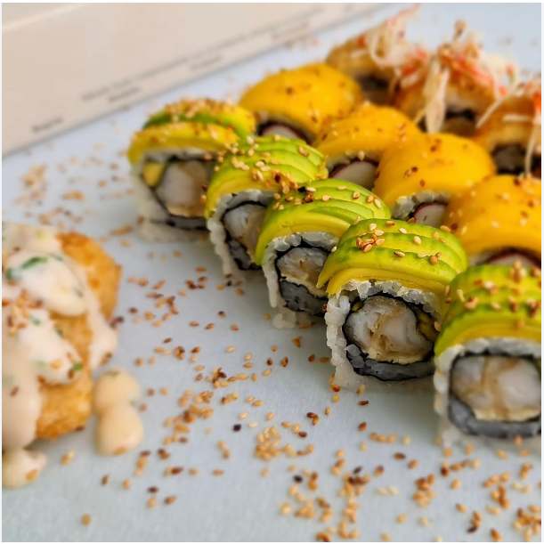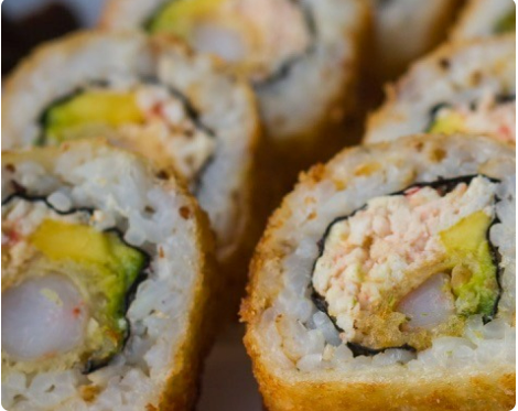 10 Bocados. Rollo crocante de surimi, langostino tempura, aguacate y queso crema.
