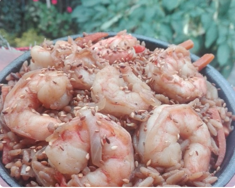Arroz salteado al wok bañado en salsa japonesa con vegetales y camarones.