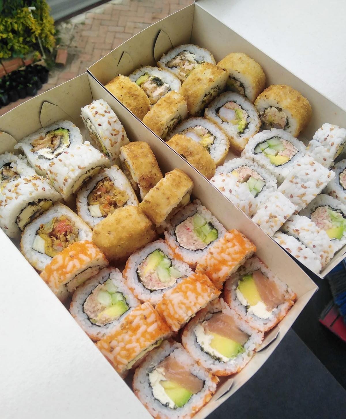 5 Bocados de Philadelphia: Surimi, Salmon fresco, aguacate y queso crema. + 5 Bocados de California: Surimi, queso crema, pepino y aguacate. surimi, palmito de cangrejo procesado con mayonesa japonesa. + 5 Bocados de Salmón Skin: piel de salmon crocante, aguacate y queso crema. + 5 Bocados de Criollo: Rollo crocante de vegetales tempura, queso moz + 5 Bocados de Yasai Go + 5 Bocados de Fruit Roll