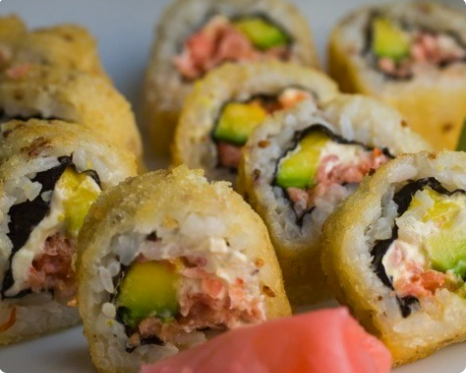 10 Bocados. Salmón tempura, aguacate y queso crema.