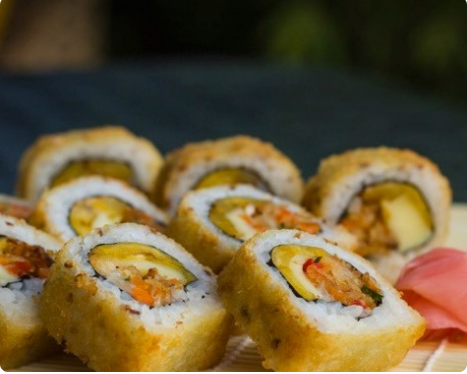 10 Bocados. Rollo crocante de vegetales tempura, queso mozzarella y plátano maduro.