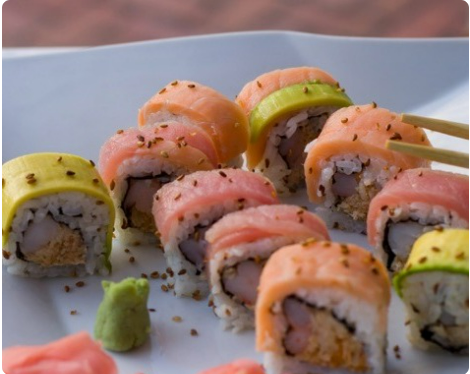 10 Bocados. Surimi, aguacate y queso crema cubierto de salmón a la parrilla.