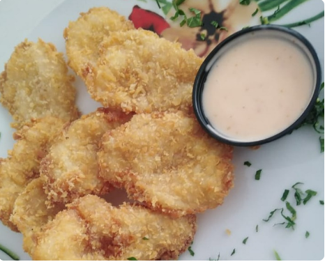 Anillos de calamar apanados acompañados con nuestra salsa dinamita, 8 unidades.