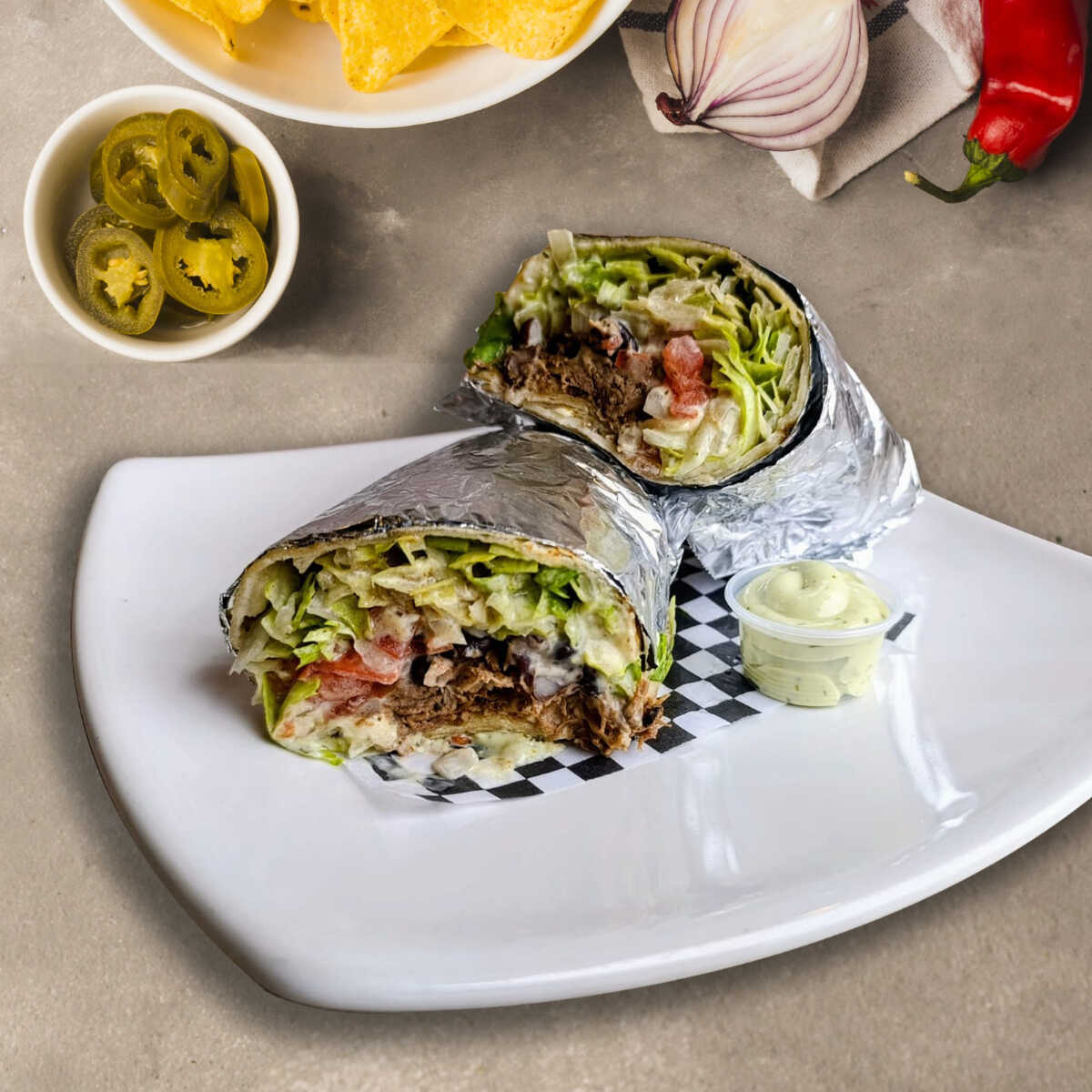 Tortilla rellena con pollo desmechado, queso, guacamole, sour cream, fríjoles, lechuga y pico de gallo.