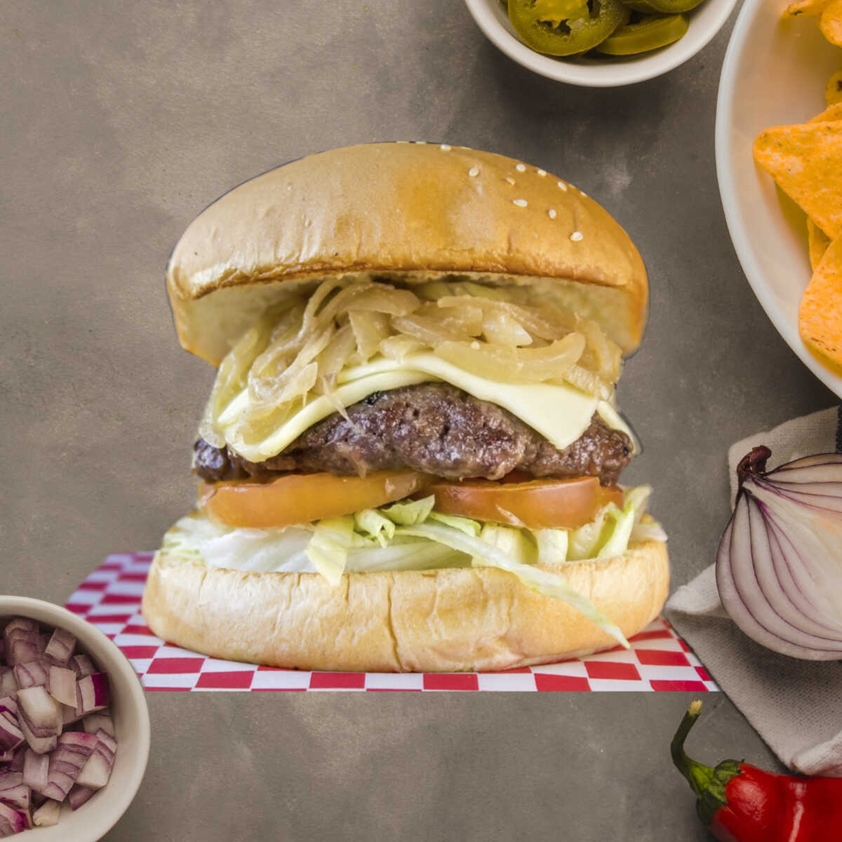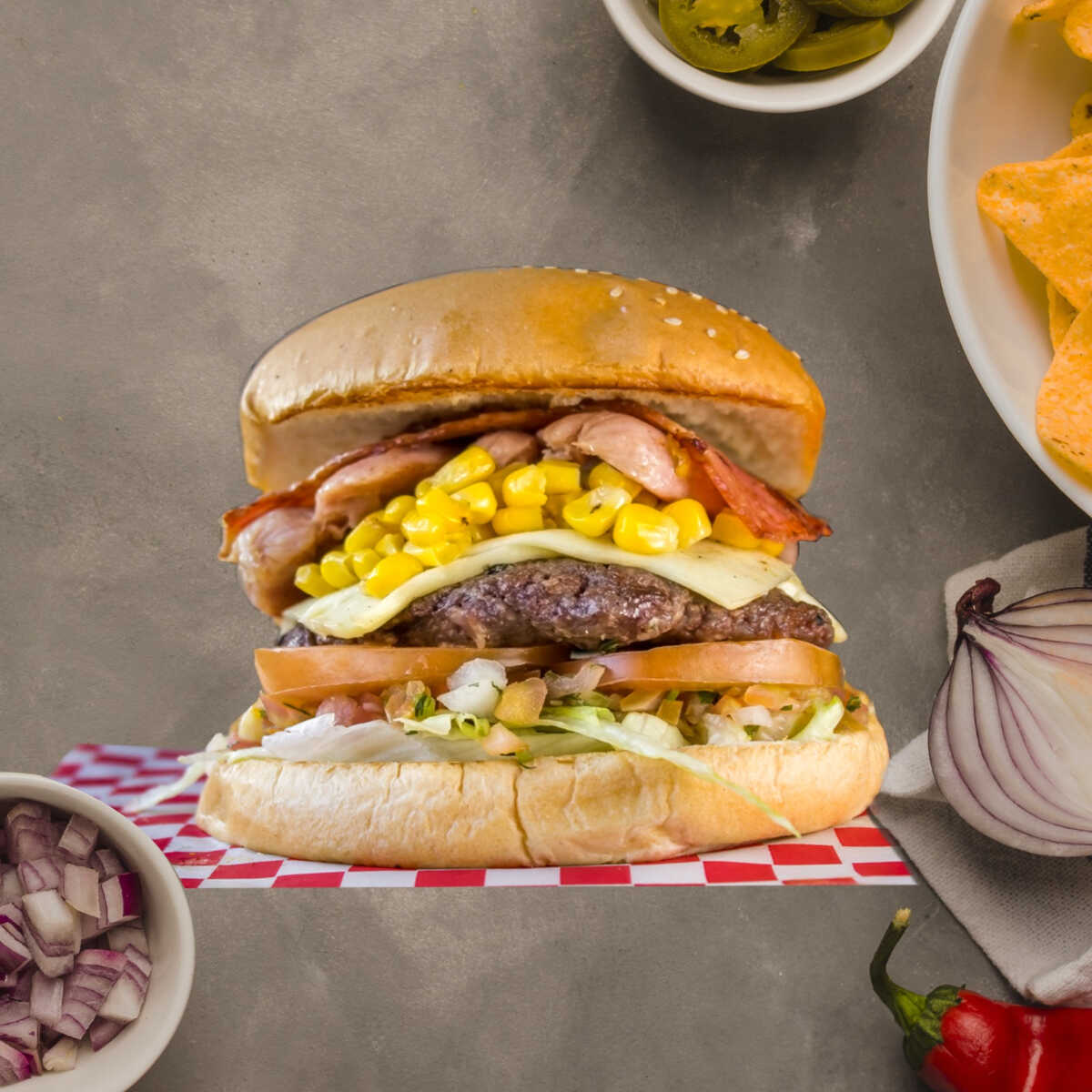Pan brioche, carne de res, pico de gallo, jalapeños, tocineta, queso mozzarella, tomate, lechuga y salsa de la casa.
