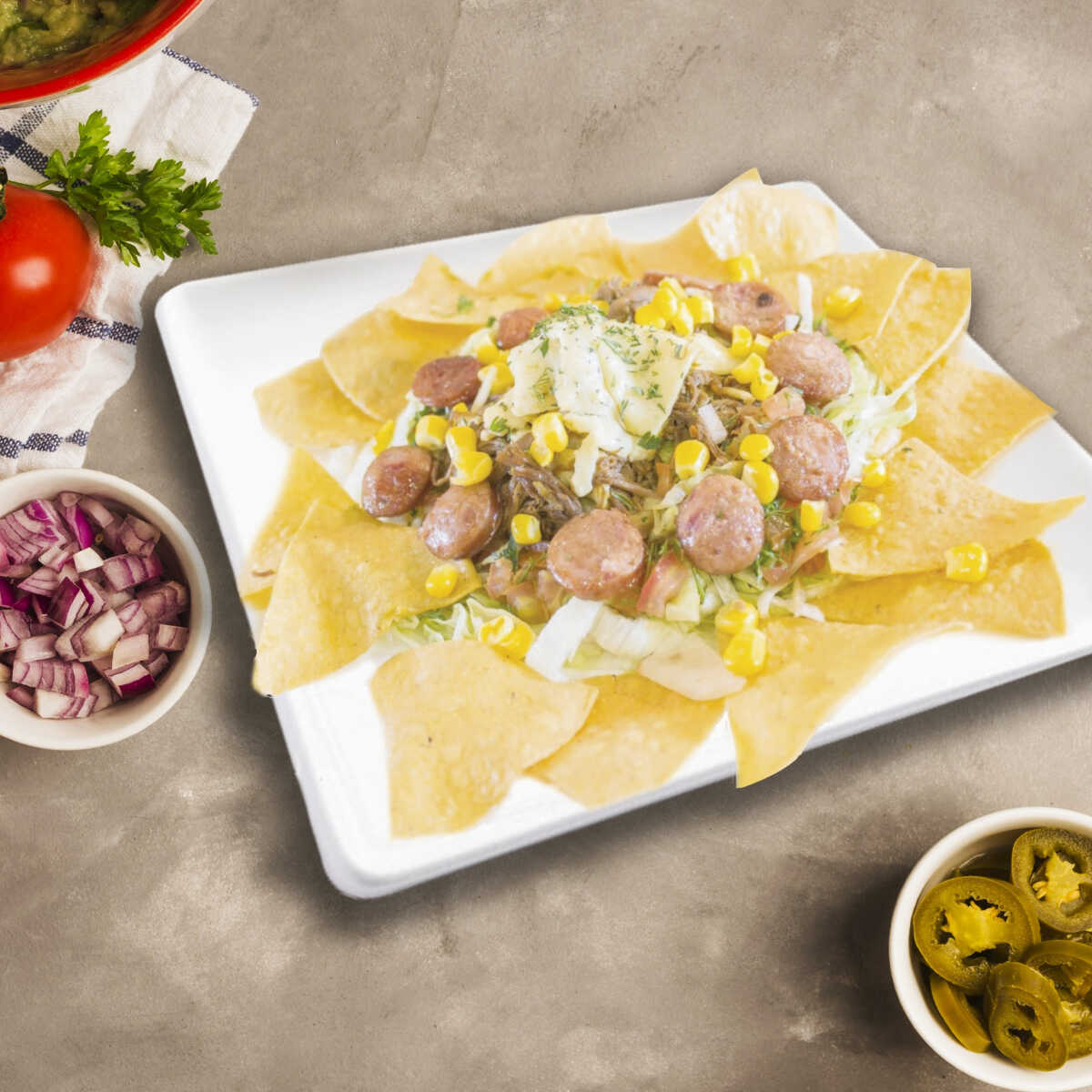 Nachos sobre una base de lechuga y pico de gallo, carne de res desmechada cocida en su caldo, chorizo, maíz dulce, fríjoles, queso, guacamole y sour cream.