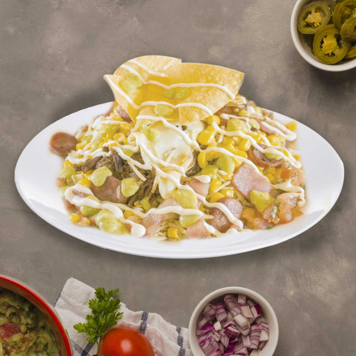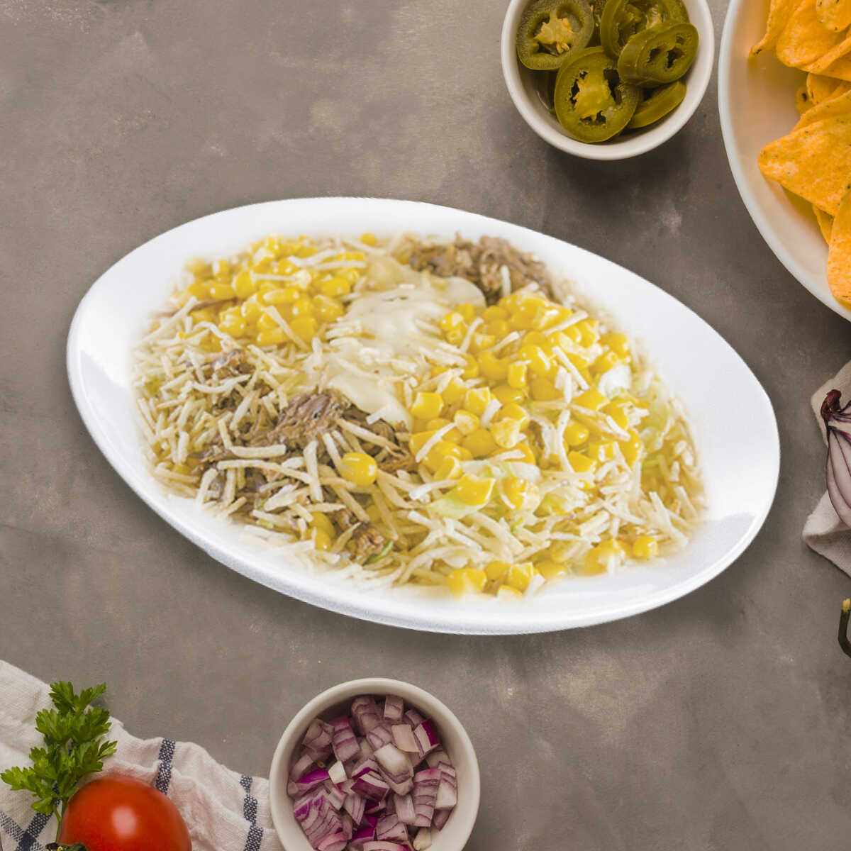 Maíz dulce salteado, carne de res desmechada, queso, chorizo, tocineta, pico de gallo, guacamole, sour cream y un toque de nachos.
