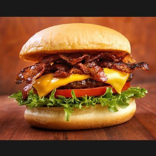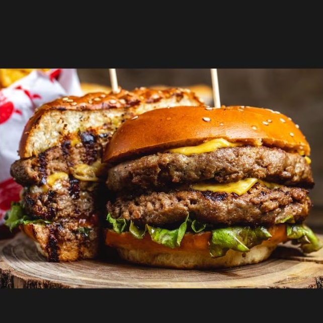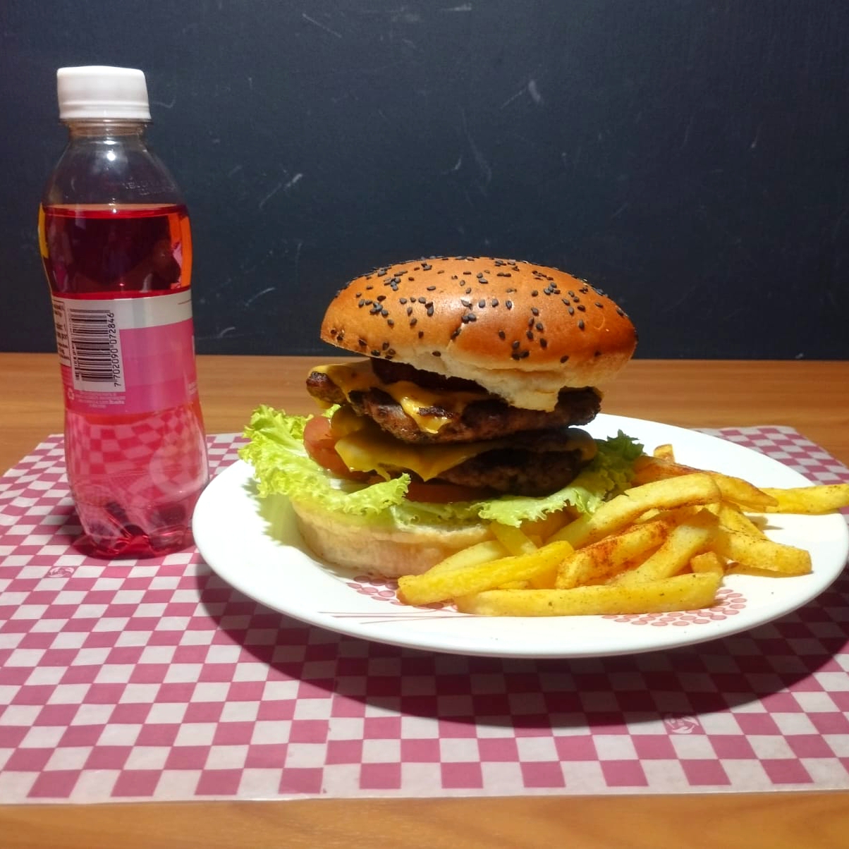 Pan con ajonjolí, doble carne, queso cheddar, tocineta, pepino agridulce, vegetales, papas chip y salsa de la casa.