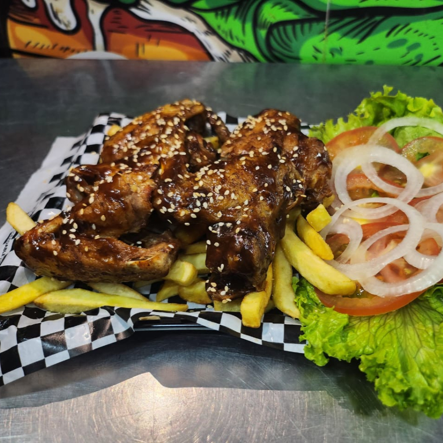 5 alitas de pollo en salsa bbq y ajonjoli, 150gr de papa francesa, ensalada fresca y salsas para aderezo