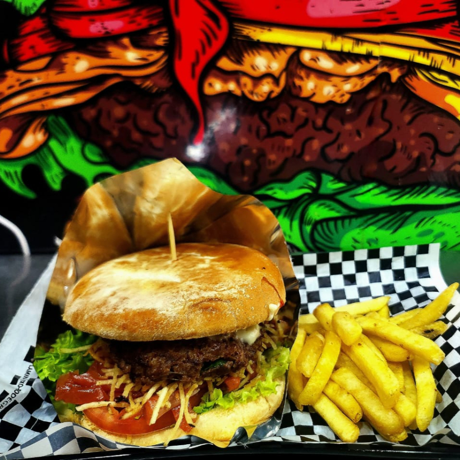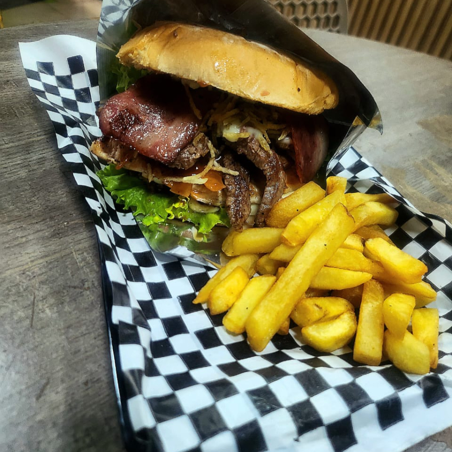 pan de hamburguesa artesanal, carne de hamburguesa artesanal, queso, jamón, papa cabello de ángel, vegetales, cebolla caramelizada, papa francesa y salsas al gusto.