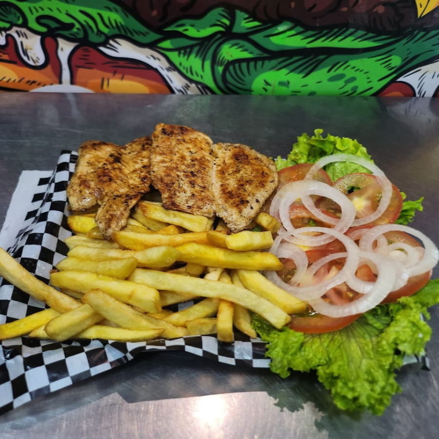 120gr de pechuga de pollo, 150gr de papa francesa, ensalada fresca y salsas para aderezo