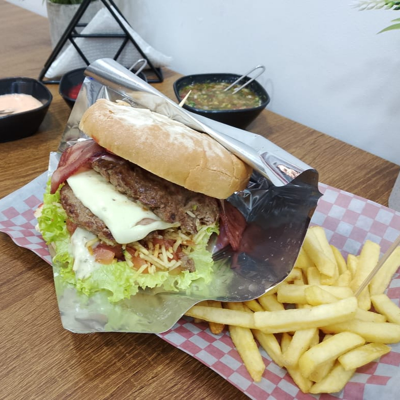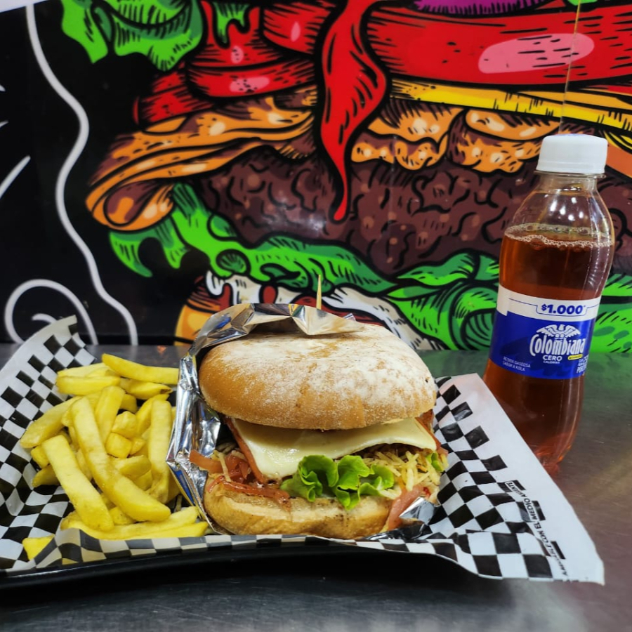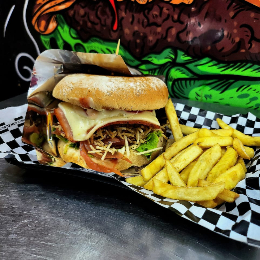 pan artesanal de hamburguesa, carne artesanal de hamburguesa, papa cabello de ángel, vegetales, cebolla caramelizada, papa francesa y salsas al gusto.