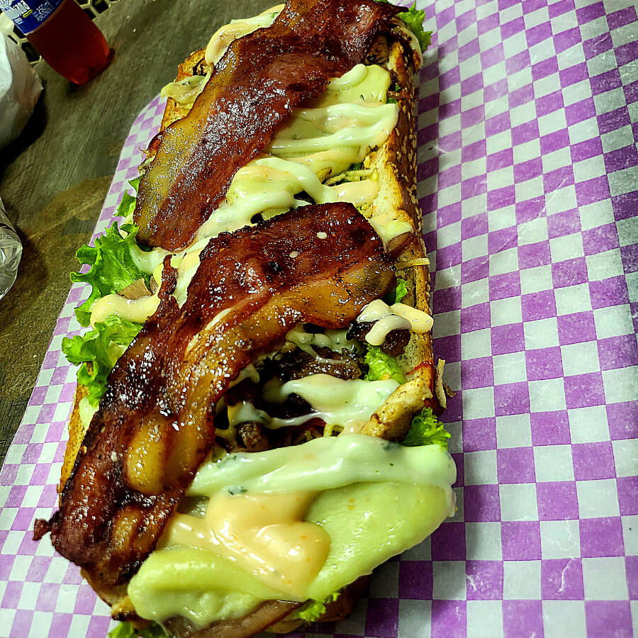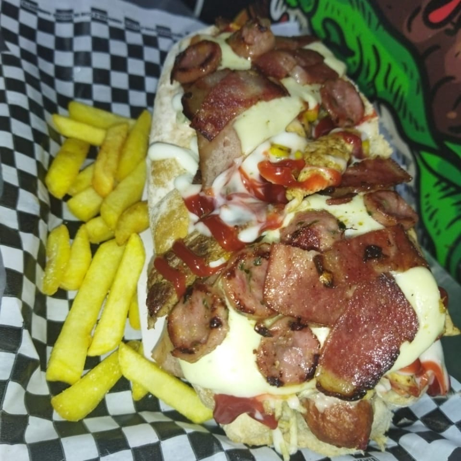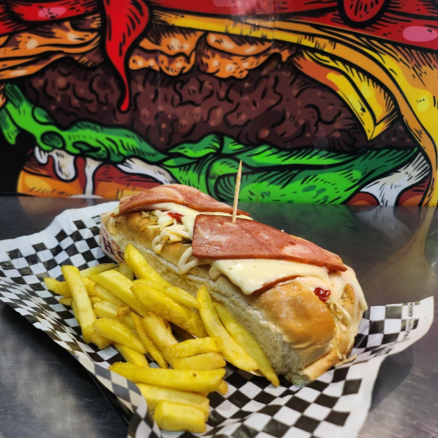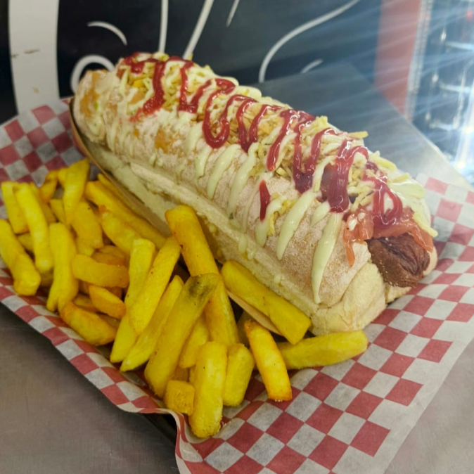 pan de perro artesanal, salchicha tipo americana, tocineta, queso, jamón, papa cabello de ángel, cebolla caramelizada, papa francesa y salsas de la casa.
