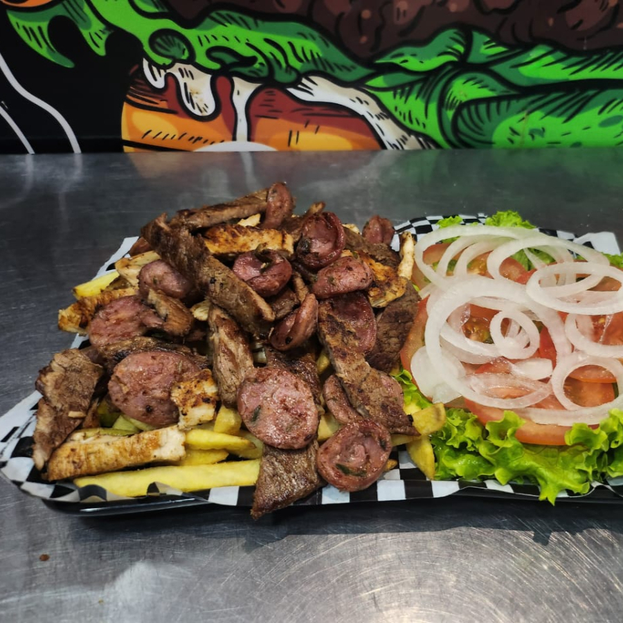 100gr de lomo de res, 100gr de pechuga de pollo, chorizo santarrosano, 150gr de papa francesa, ensalada fresca y salsas para aderezo