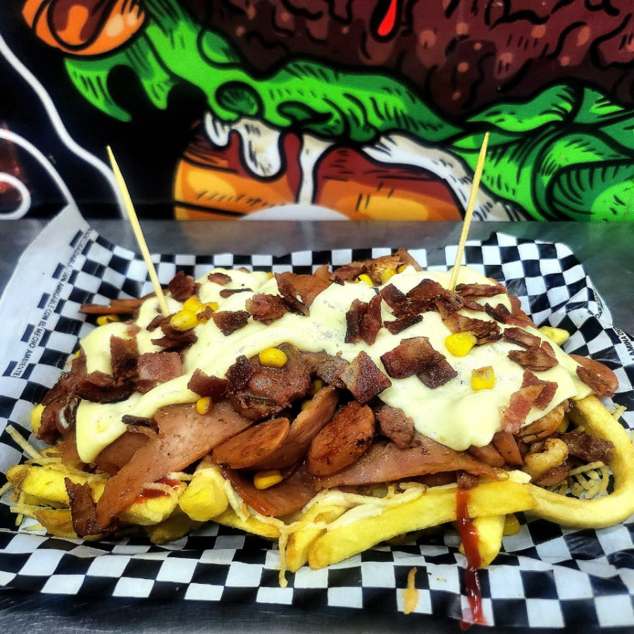 200gr de papas francesas, 100gr de lomo de res, 100gr de pechuga de pollo, chorizo santarrosano, tocineta, queso, jamón, maíz, cebolla caramelizada, papa cabello de ángel y salsas de la casa