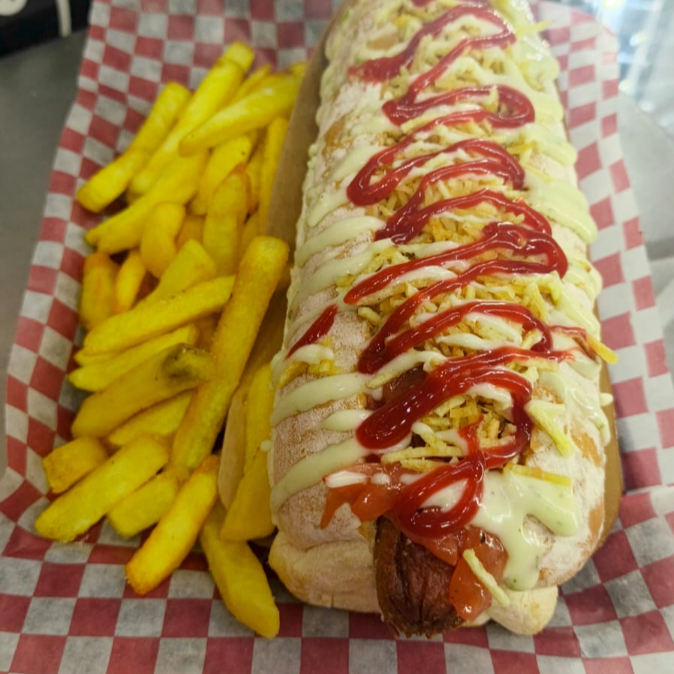 pan de perro artesanal, salchicha tipo americana, papa cabello de ángel, cebolla caramelizada, papa francesa y salsas al gusto.
