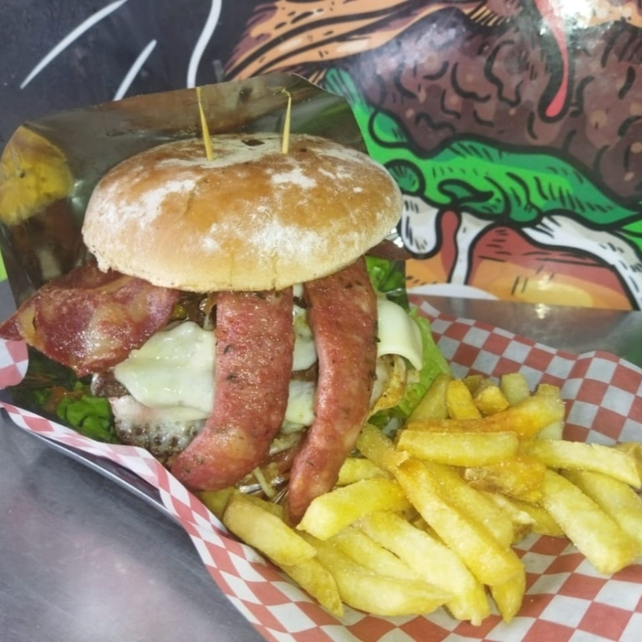 pan de perro artesanal, chorizo santarrosano, papa cabello de ángel, cebolla caramelizada, papa francesa y salsas de la casa.