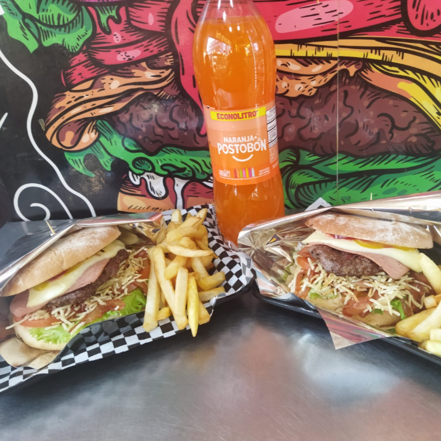 pan artesanal de hamburguesa, carne artesanal de hamburguesa, lomo de res, pechuga de pollo, tocineta, queso, jamón, papa cabello de ángel, vegetales, cebolla caramelizada, papa francesa y salsas al gusto