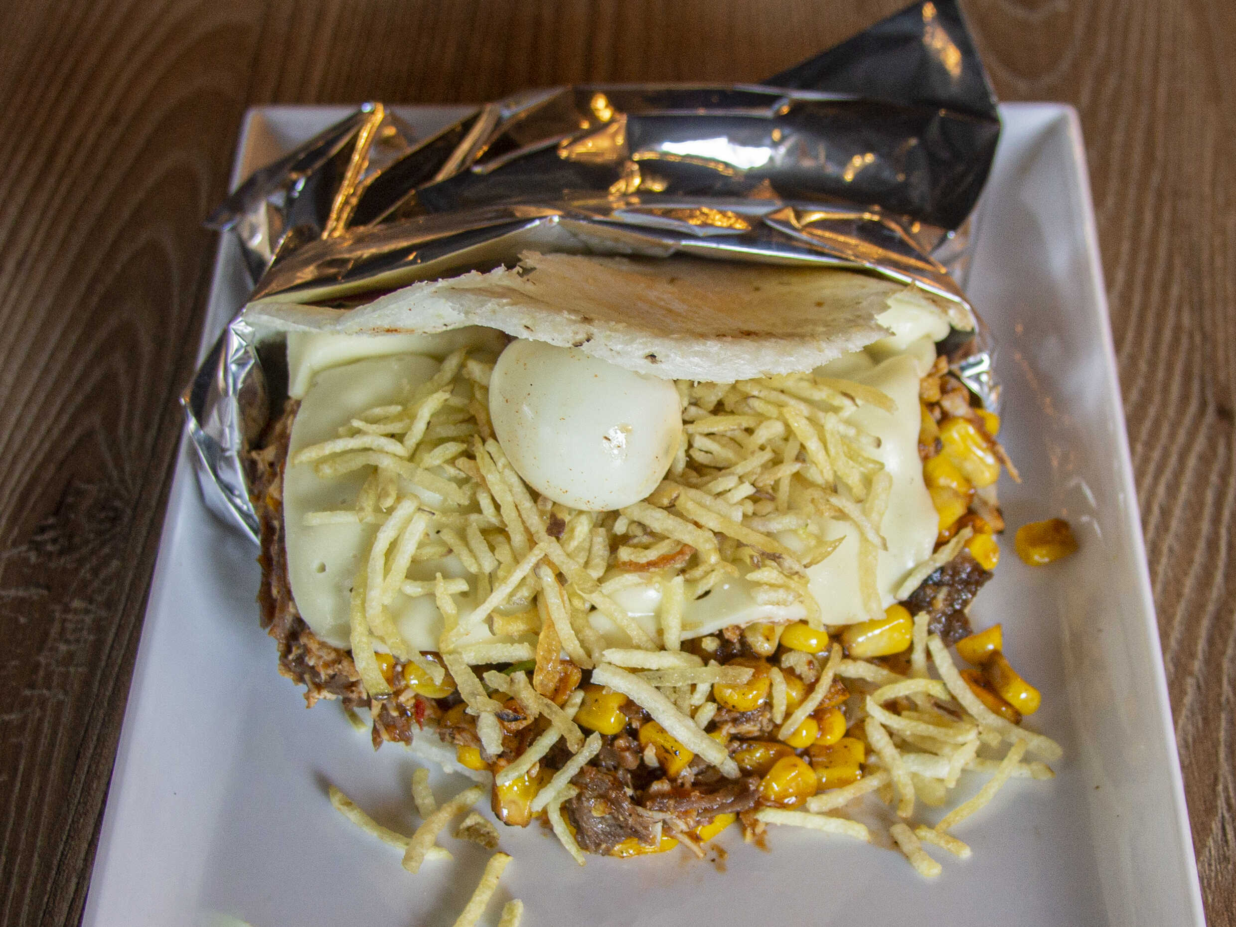 Carne desmechada, pollo desmechado, cebolla grille, mazorca, papa chip, huevo de codorniz, y salsas de la casa
