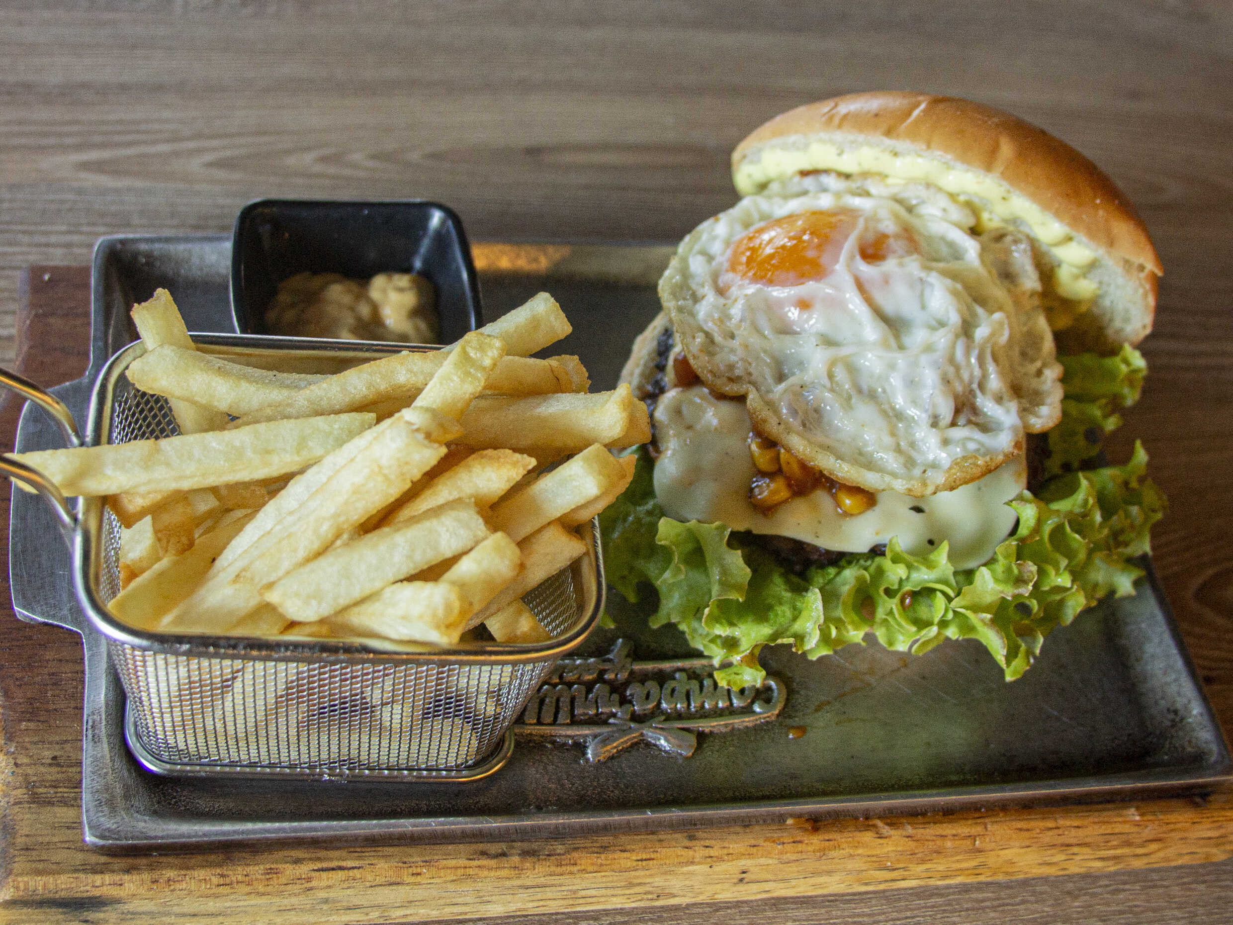 Dos carnes de la casa de 150 g cada una, doble queso, tomate, lechuga, cebolla grille, tocineta y salsas de la casa.