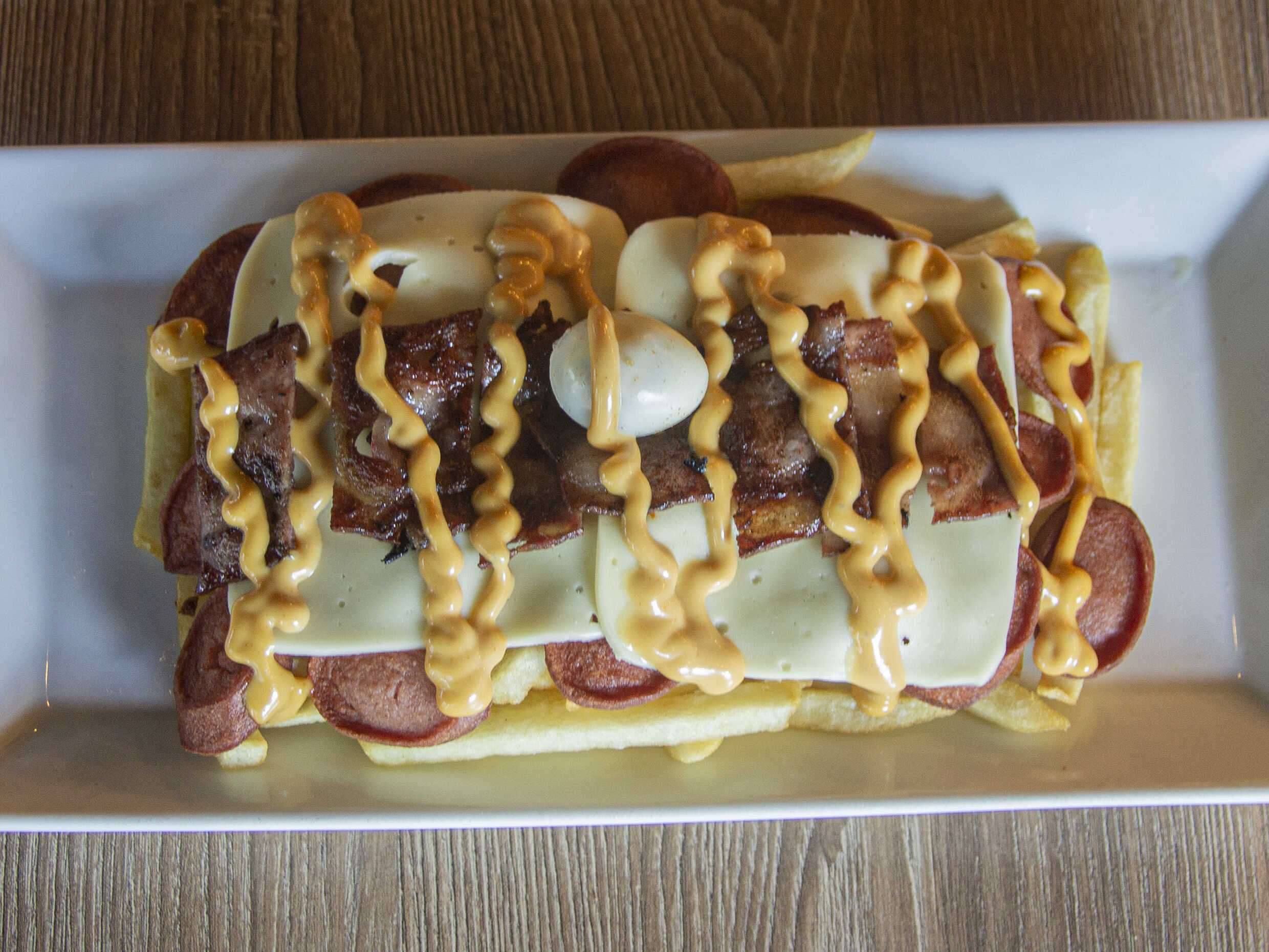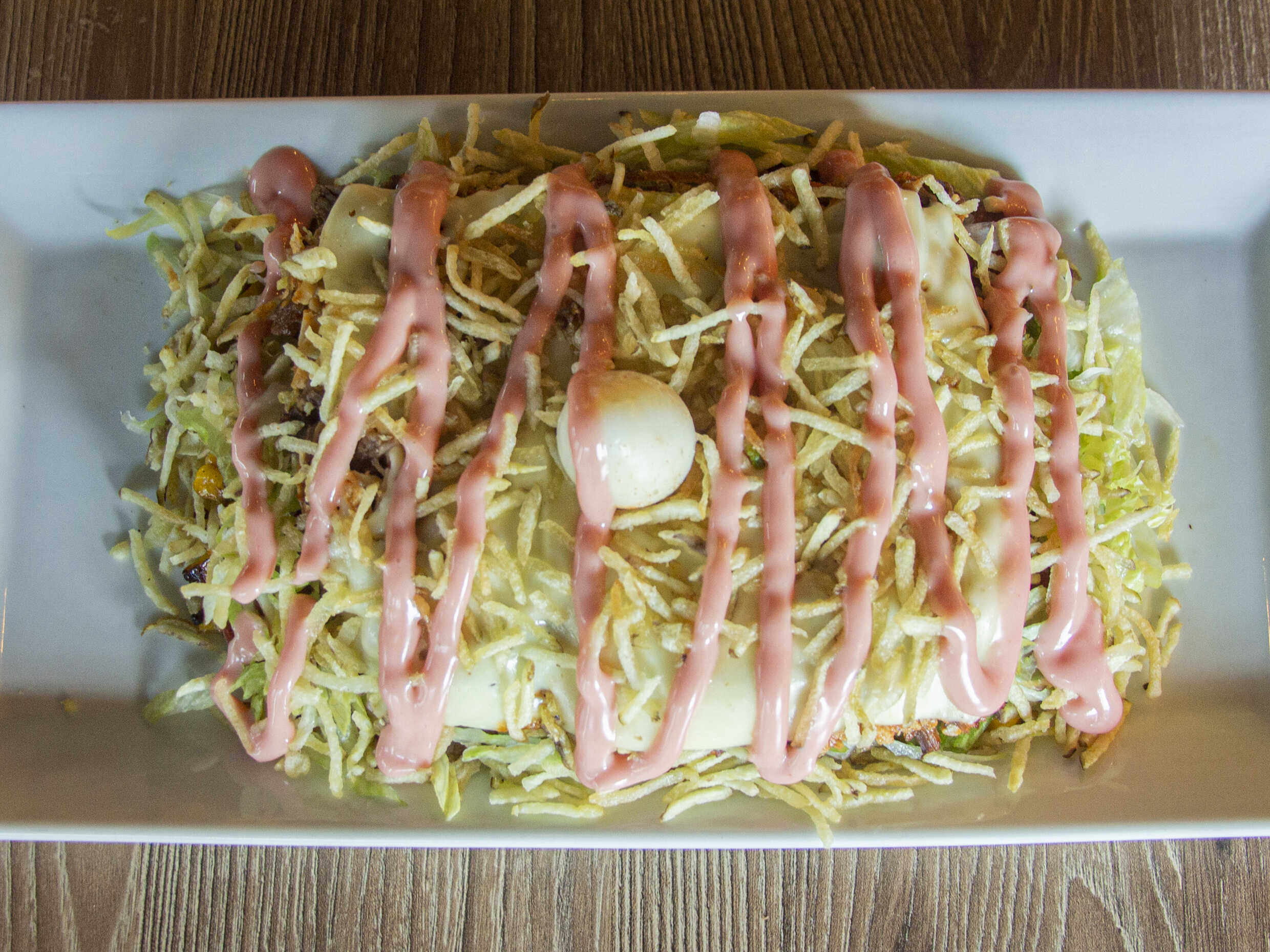 Carne desmechada, pollo desmechado, queso, chorizo, papá francesa, lechuga, cebolla grille, papa chip, huevo de codorniz y salsa de la casa