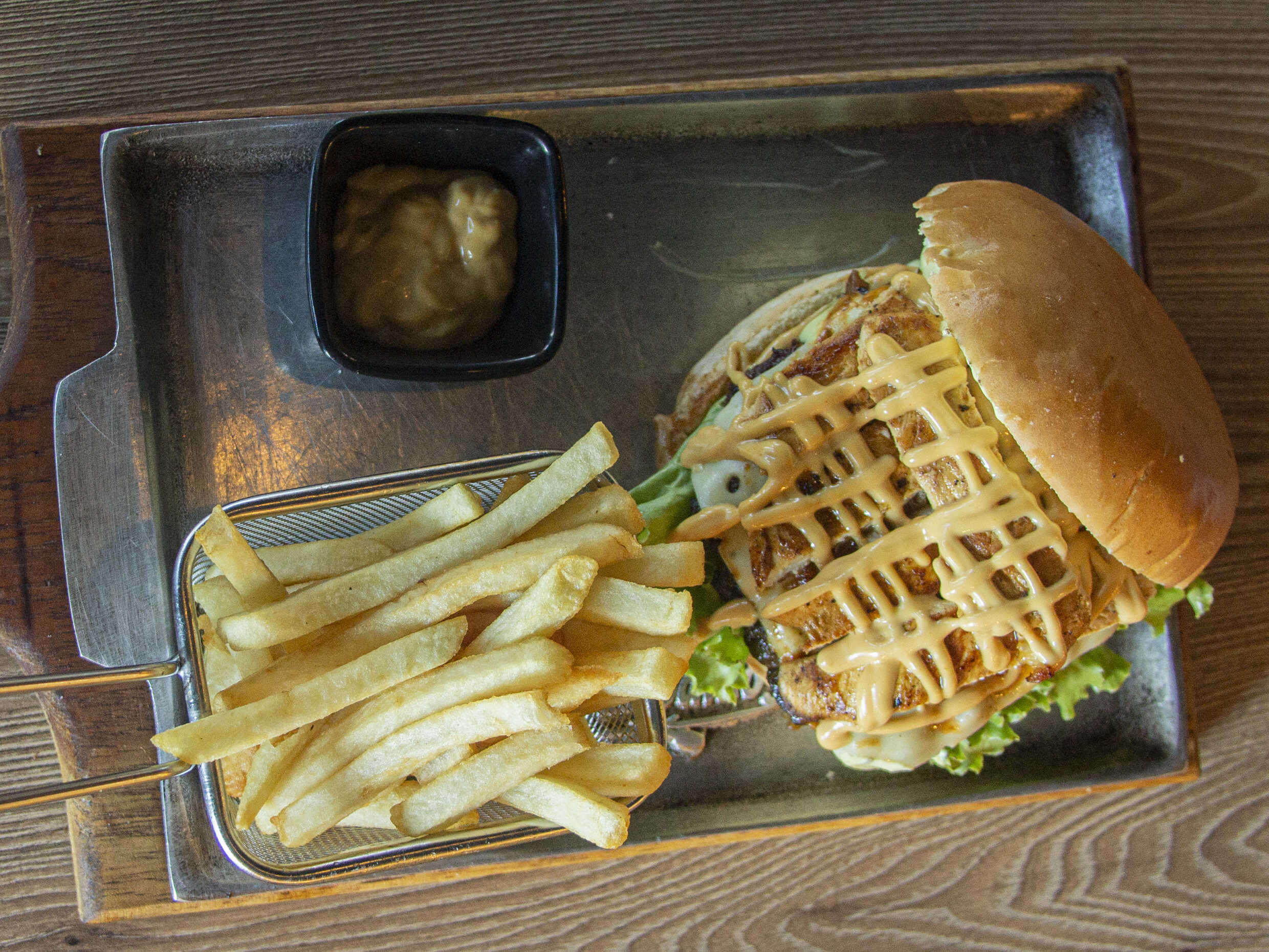 150 g De carne de la casa, queso, tomate, lechuga, cebolla grille, tocineta, nachos, guacamole y salsas de la casa.
