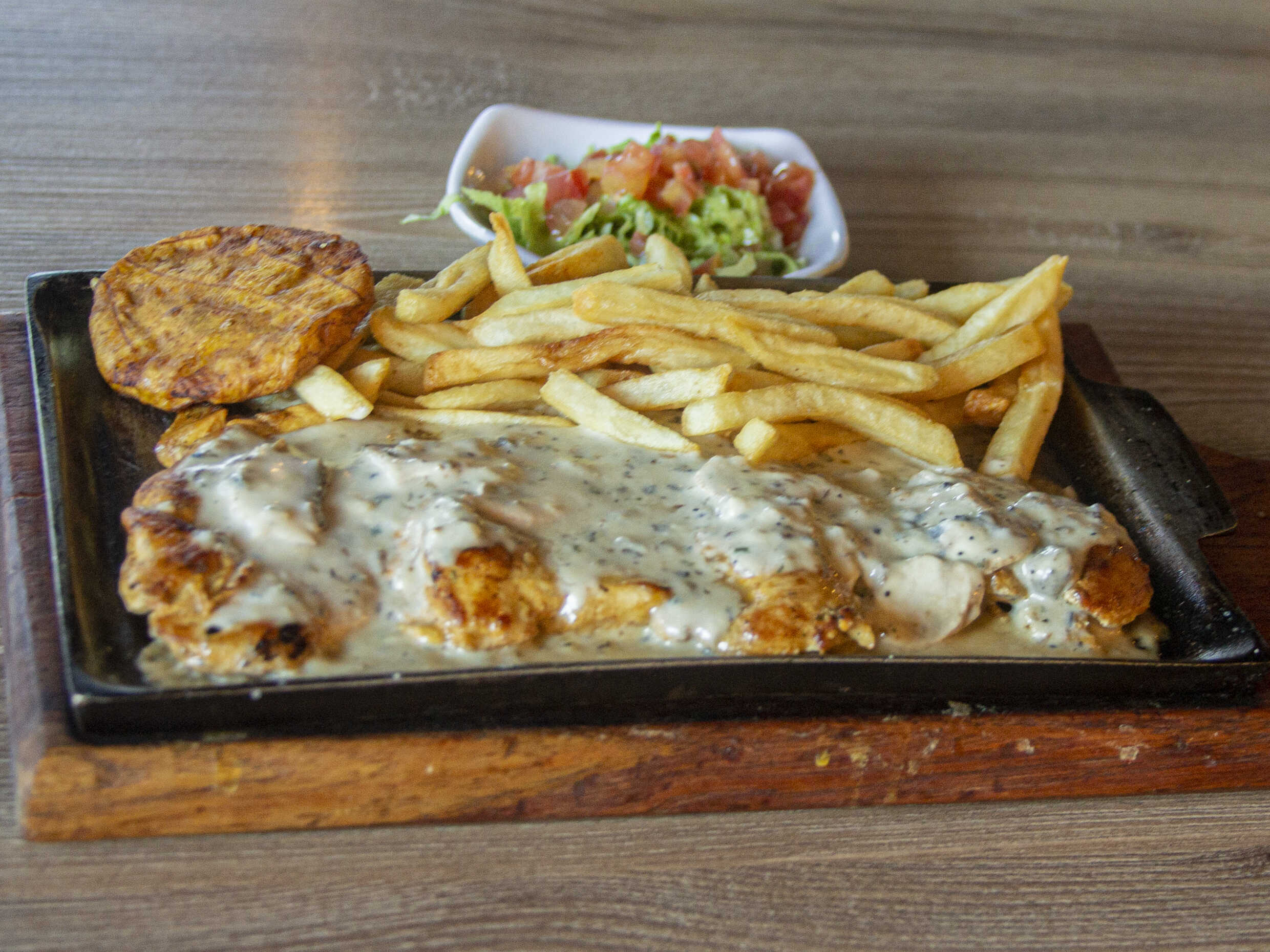 Steak de pollo asado a la plancha, bañado en salsa de champiñones, con papa francesa o papa criolla, patacón y ensalada (lechuga, tomate, cebolla).