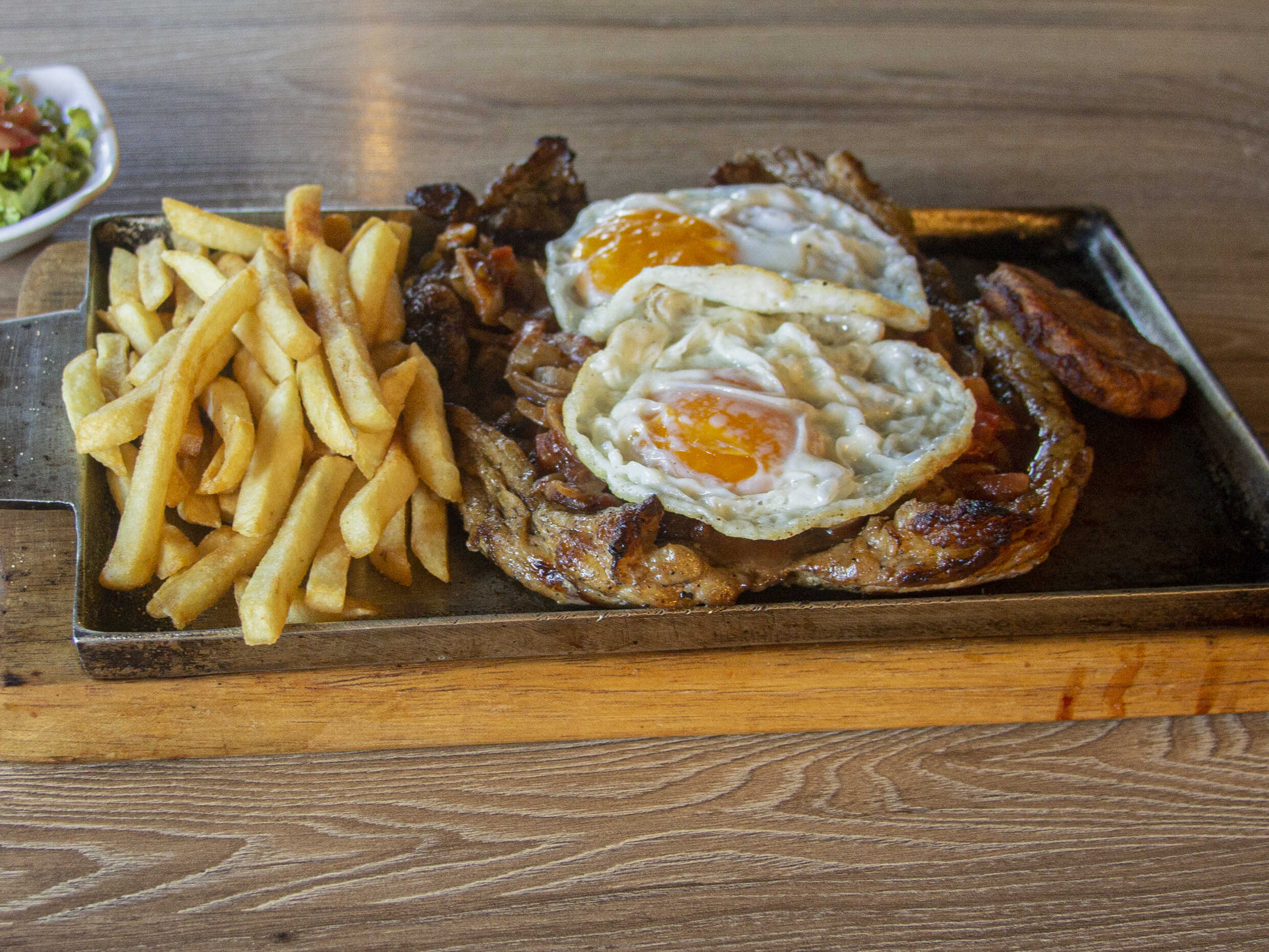 Steak de res asado a la parrilla, hogao y huevo frito, con papa francesa o papa criolla, patacón y ensalada (lechuga, tomate, cebolla).