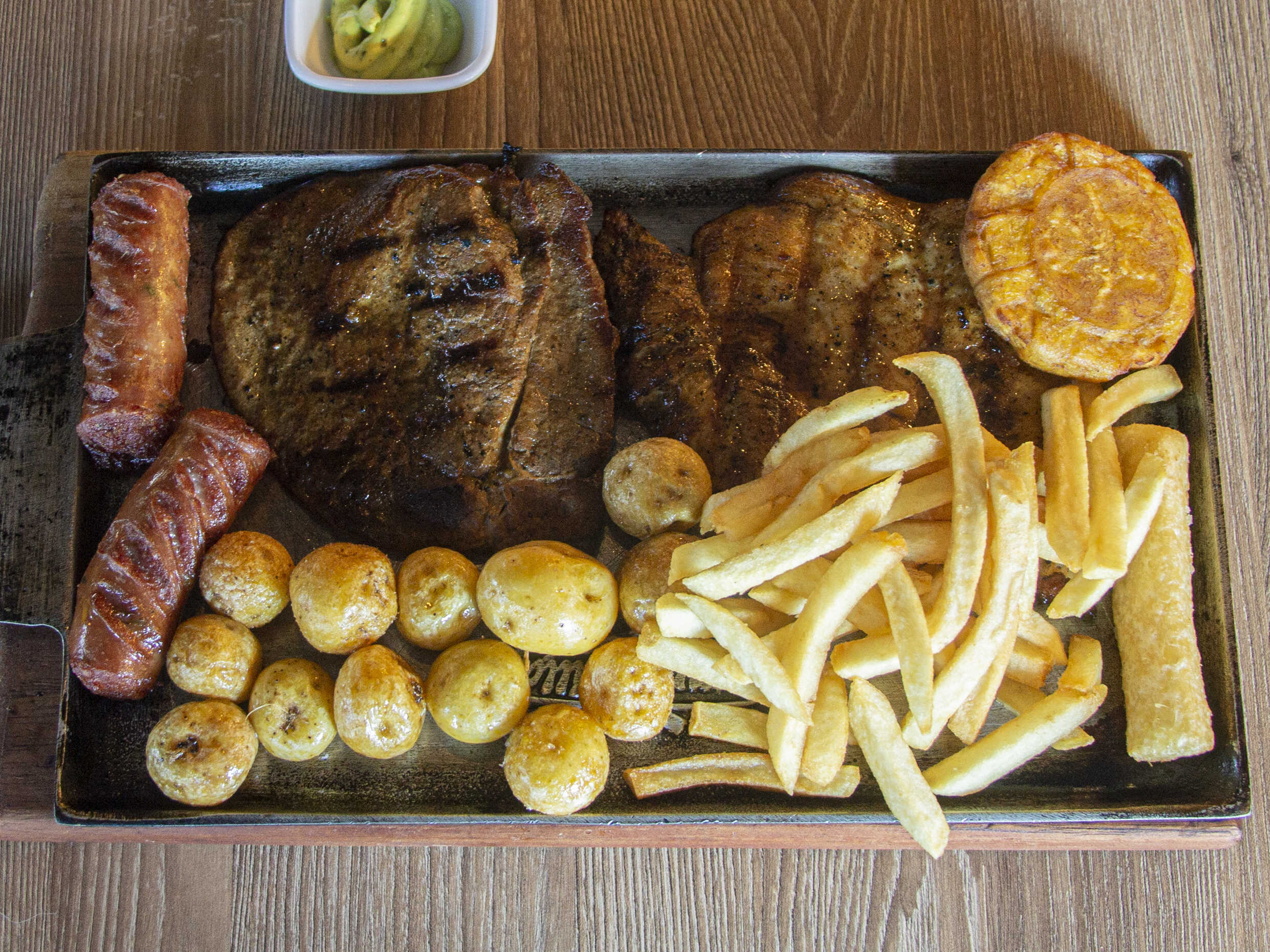 Steak de res 100%, steak de pollo, chorizo, papa francesa, papa criolla, patacón y yuca frita.