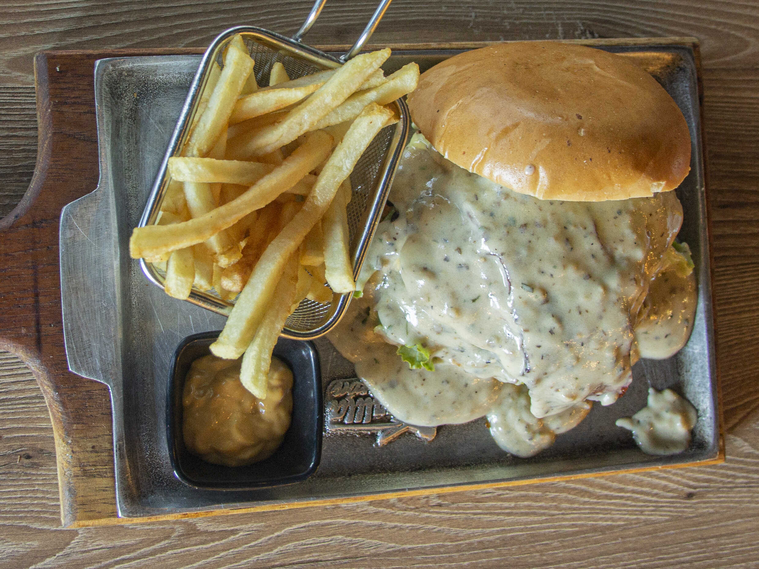 250 g De carne de la casa, queso, tomate, lechuga, cebolla grille, tocineta, bañada en salsa de champiñones y salsas de la casa.