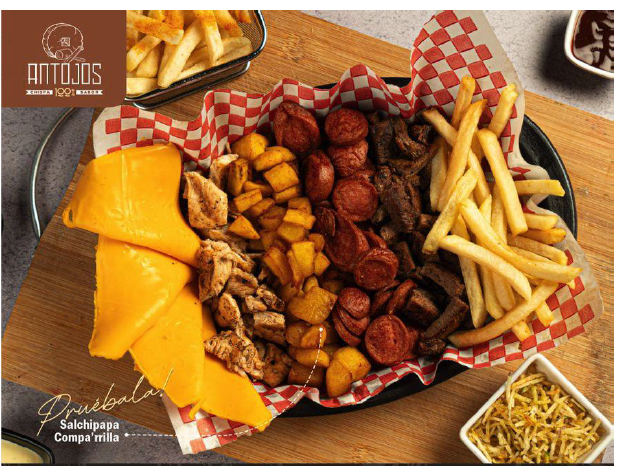 100% Carne de res, pollo, carne de cerdo, chorizo, papa francesa, papa criolla, patacón y yucas fritas.