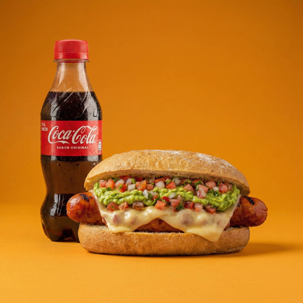 Pan suave con chorizo santarrosano, queso derretido, pico de gallo y salsas, acompañado de bebida. Simple, delicioso y perfecto para cualquier antojo.