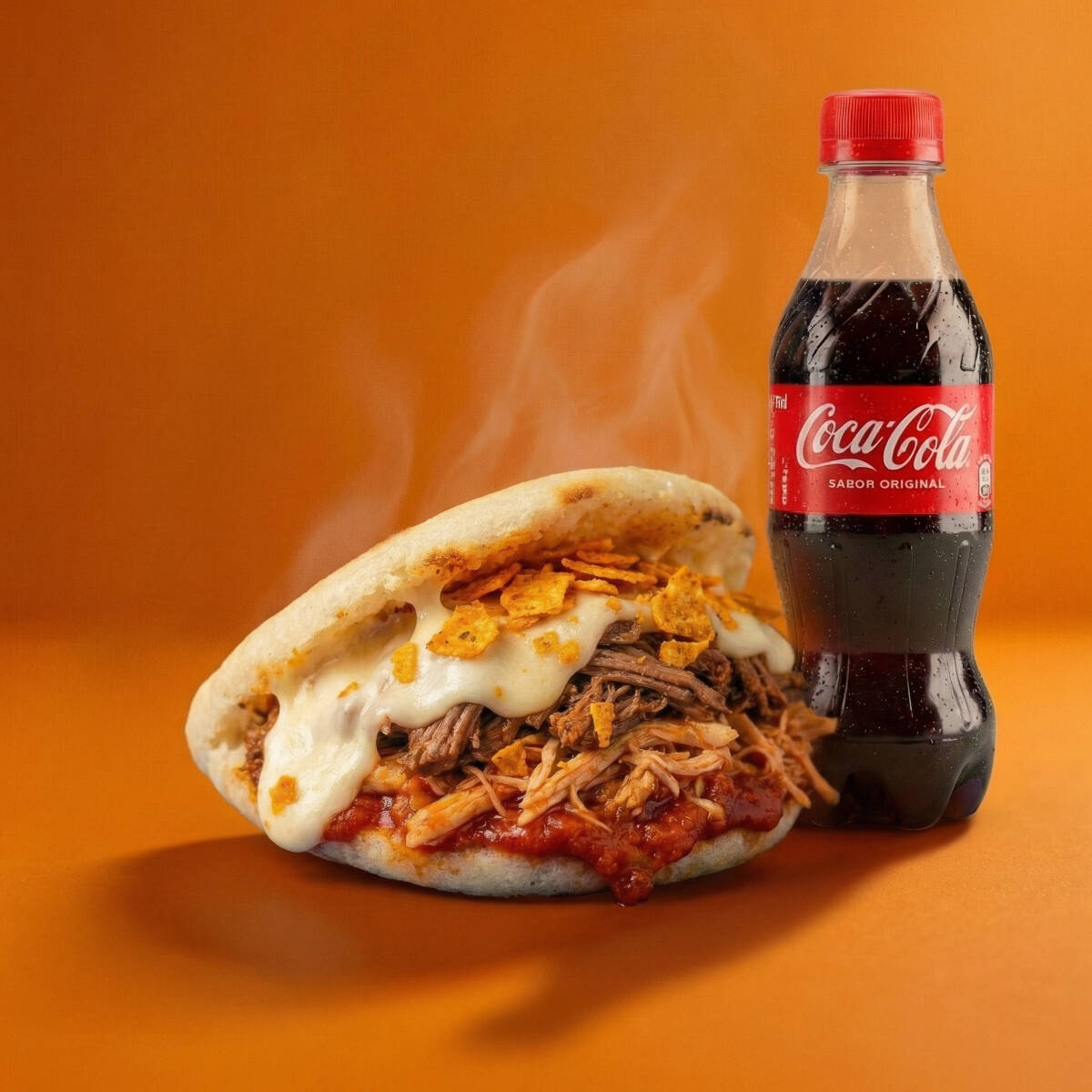 Arepa dorada rellena con queso derretido, 2 proteínas, chorizo y doritos triturados, acompañada de bebida. Una arepa poderosa, cargada de sabor.