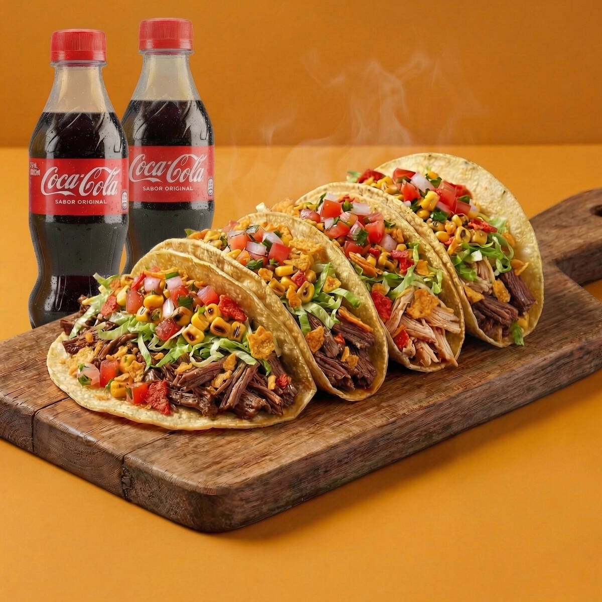 x4 Tacos de tortilla suave relleno con carne sazonada, lechuga fresca, maíz dulce, doritos triturados, pico de gallo y queso. Sabor callejero irresistible.