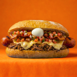 Choriperro cargado con chorizo santarrosano, proteína adicional, tocineta, queso derretido, guacamole, pico de gallo y huevo de codorniz. Grande, contundente y brutalmente delicioso.