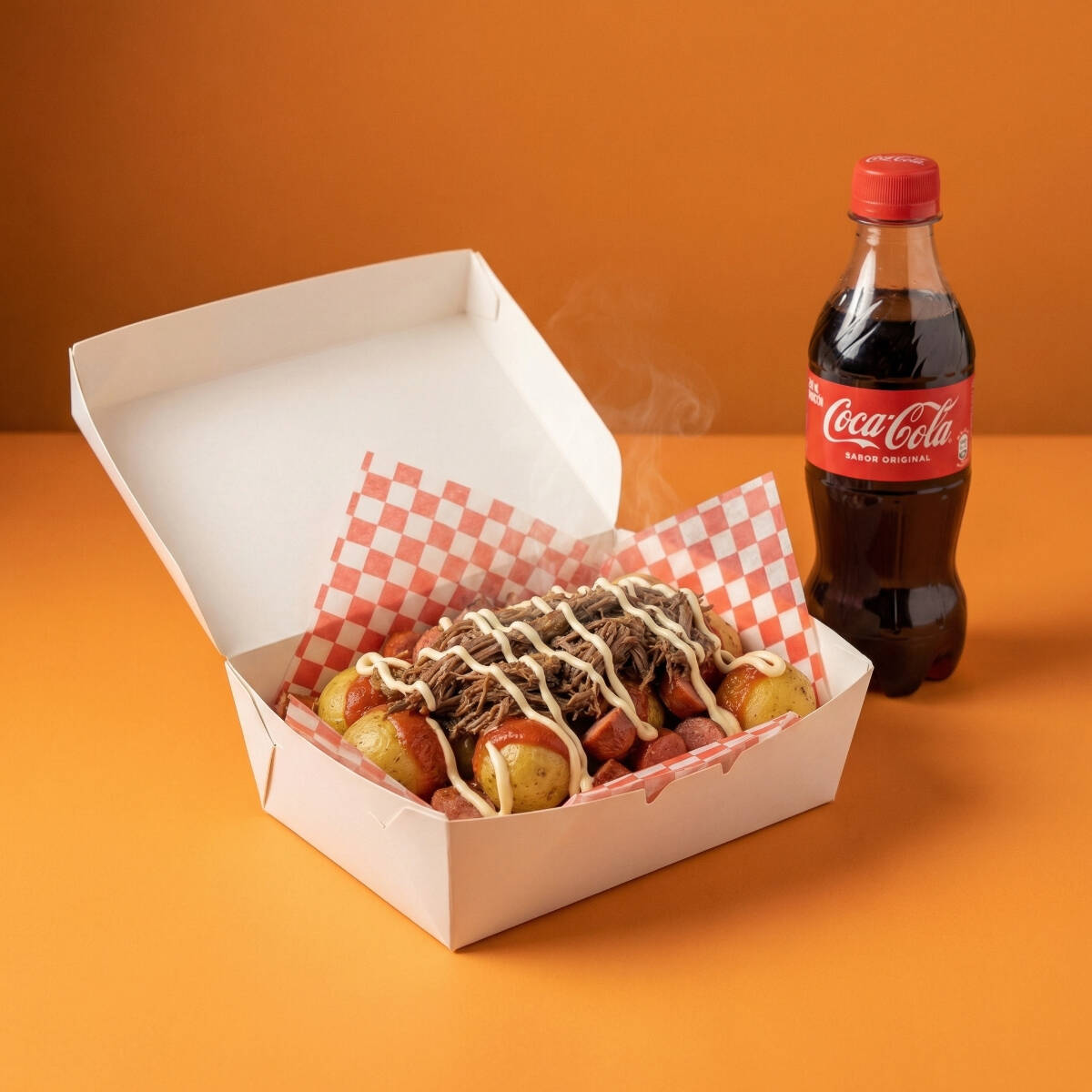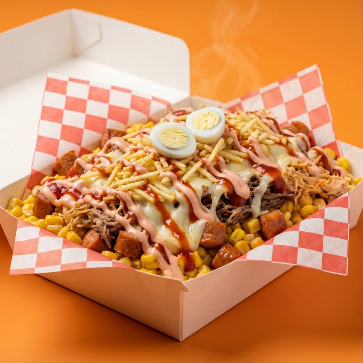 Una mezcla brutal de sabor: maíz tierno caliente, acompañado de 2 proteínas a elección, salchicha picada, huevos de codorniz, papa ripio crujiente y queso derretido. Todo bañado con nuestra salsa de la casa que lo lleva a otro nivel. Perfecta para un buen antojo y bien cargado.