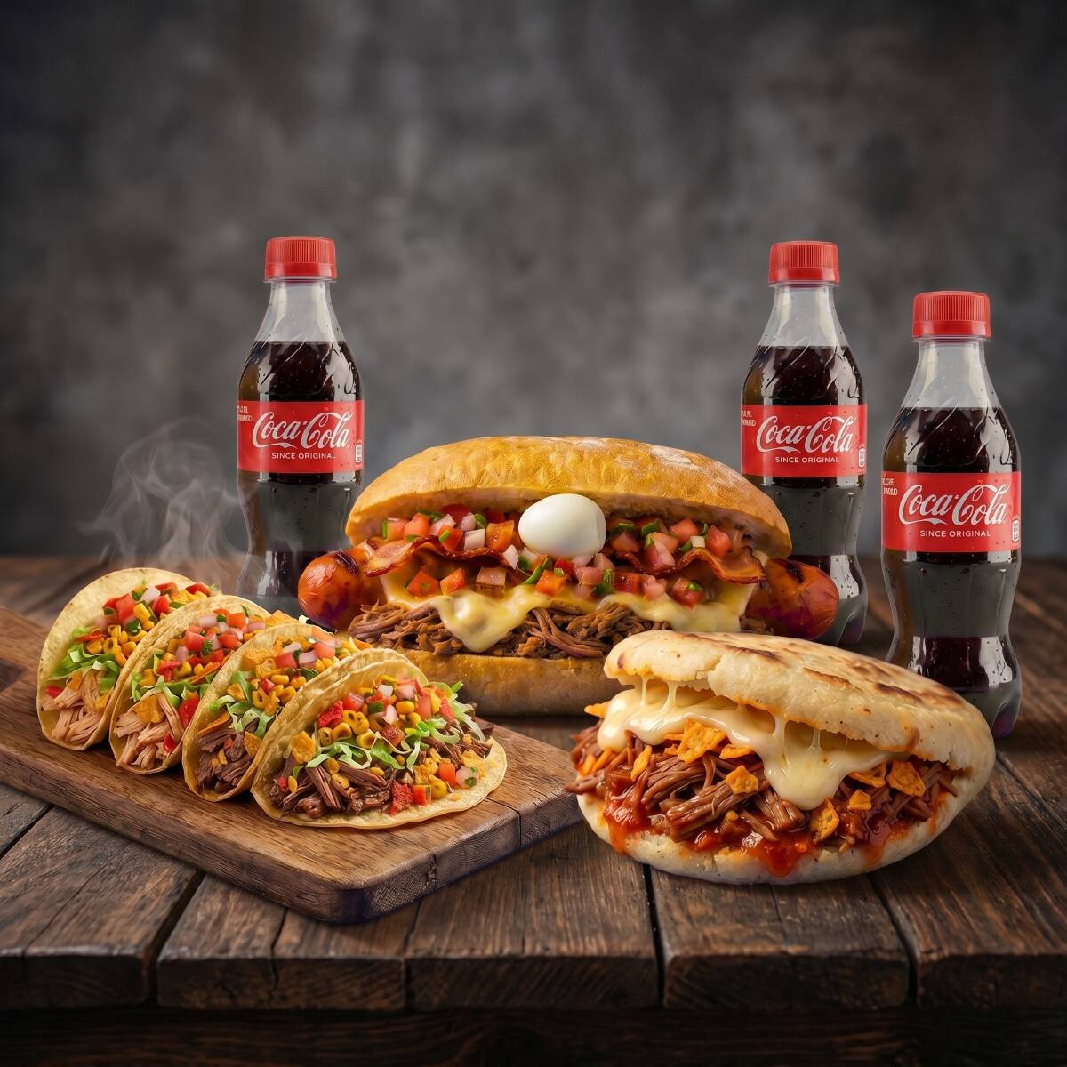 Disfruta un combo ideal para compartir: 4 tacos mixtos (2 carne & 2 pollo), 1 choriperro chimba con proteína, 1 arepa rellena chimba & 3 bebidas de 250ml a elección