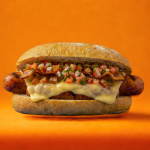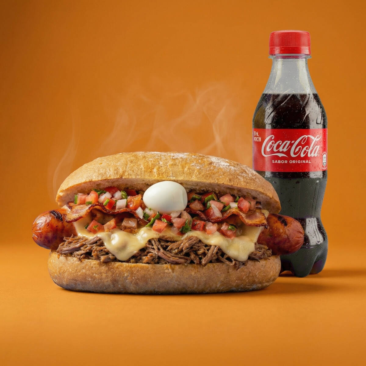 Choriperro cargado con chorizo santarrosano, proteína adicional, tocineta crujiente, queso derretido, guacamole, pico de gallo y huevo de codorniz, más bebida. Un combo brutalmente delicioso.