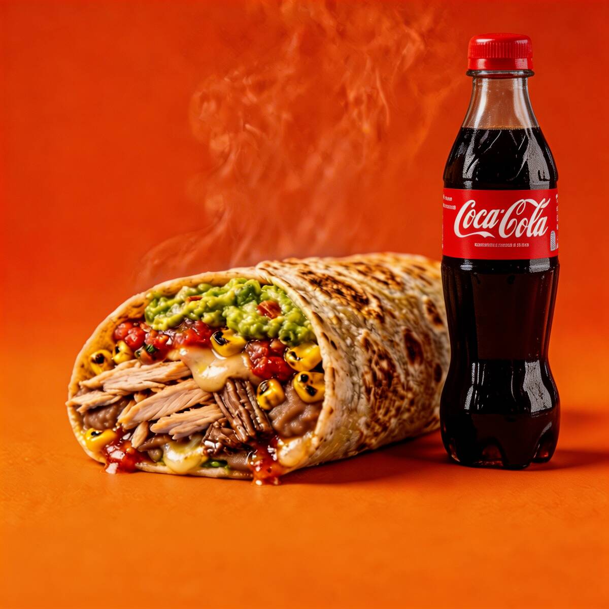 Burrito grande con 2 proteínas jugosas, lechuga fresca, maíz, doritos triturados, pico de gallo, frijol refrito, guacamole cremoso y queso derretido, acompañado de bebida. Un combo abundante y lleno de sabor.