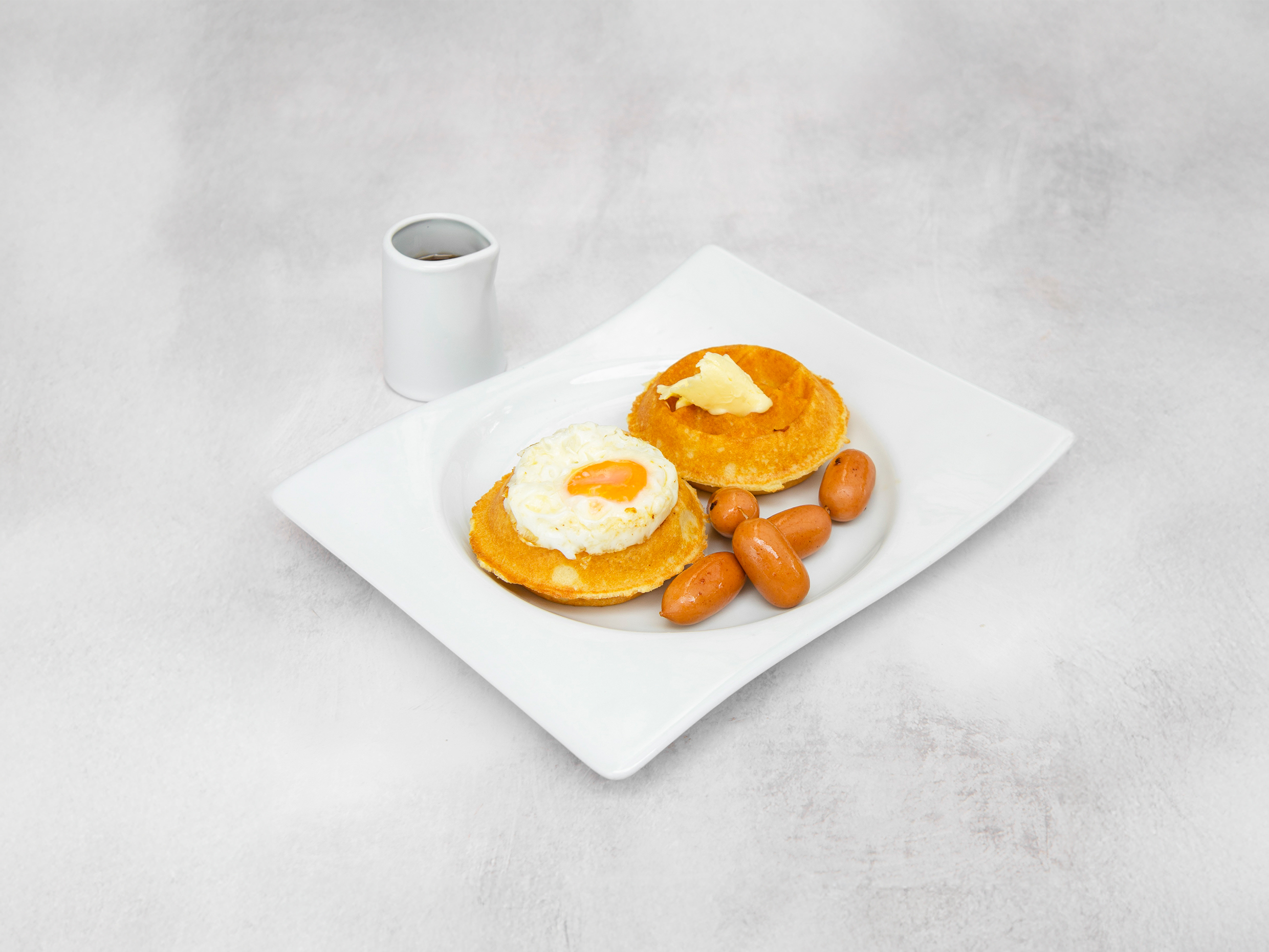 Mini Waffle con Huevo Mantequilla Salchicha y Syrup